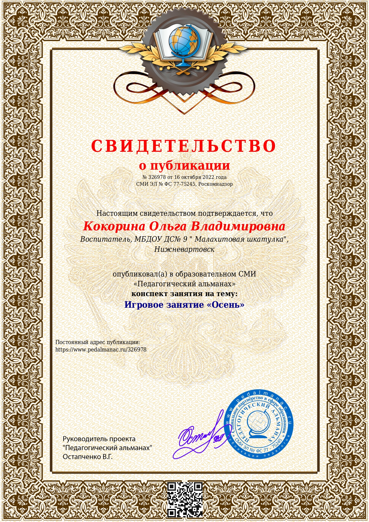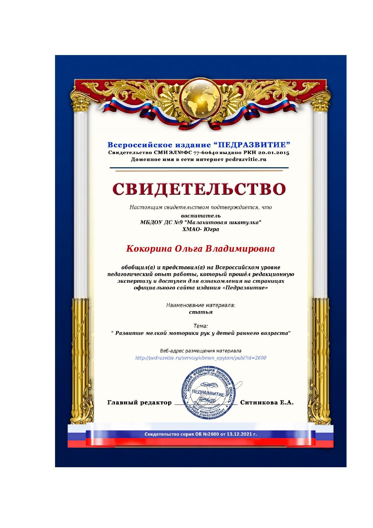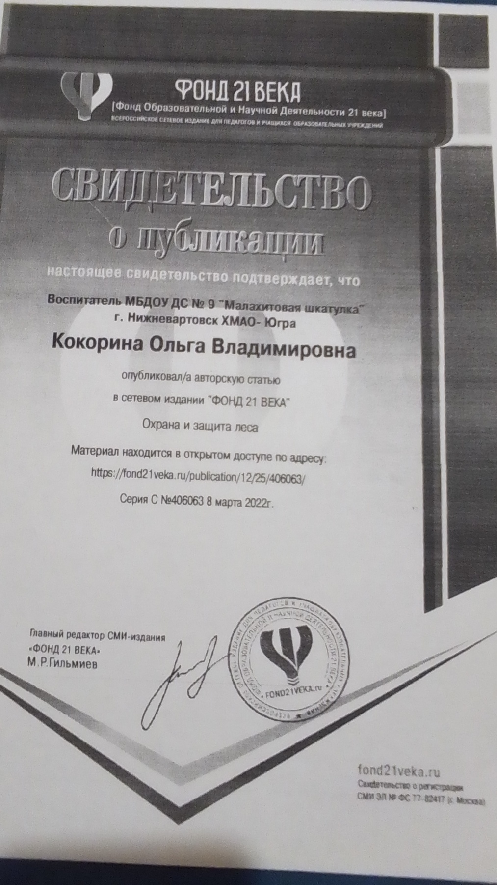 Свидетельство о публикации авторской статьи