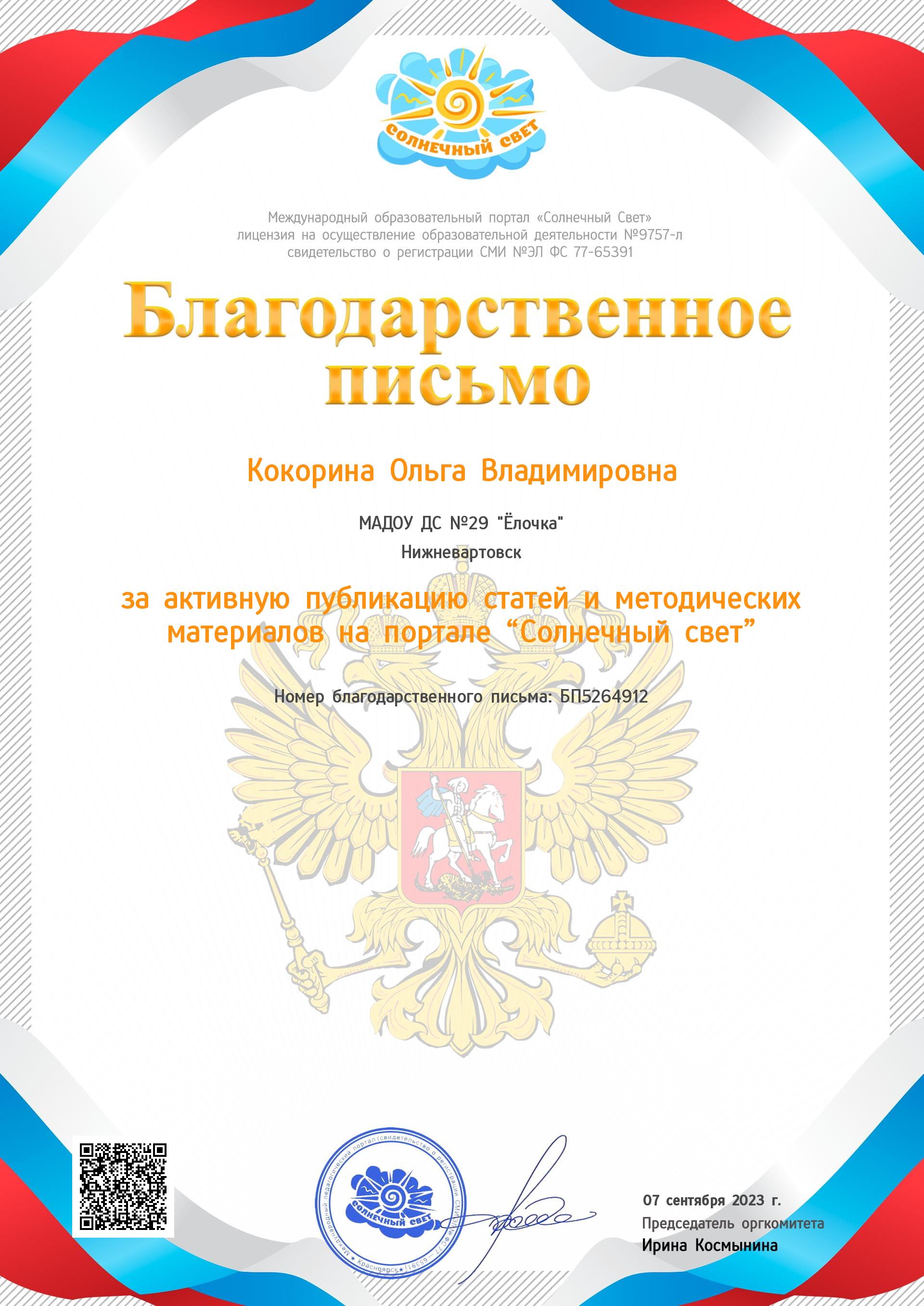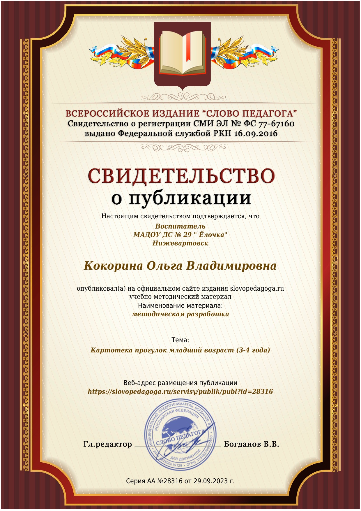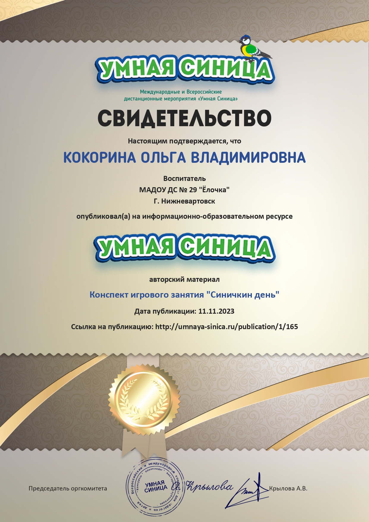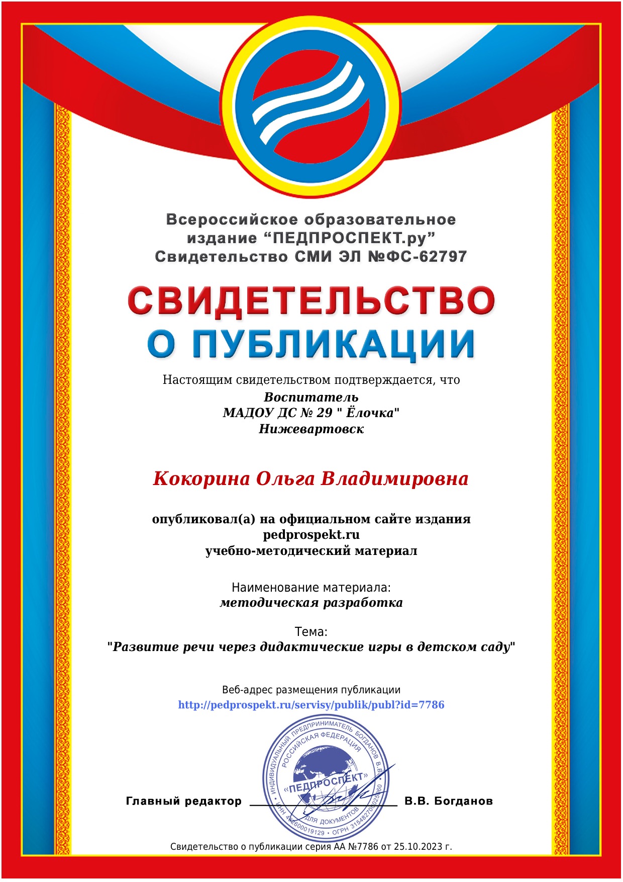 Свидетельство о публикации авторской статьи