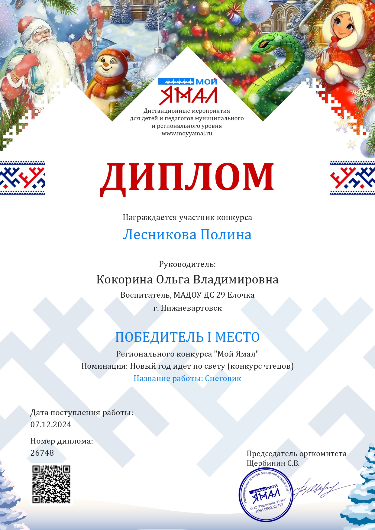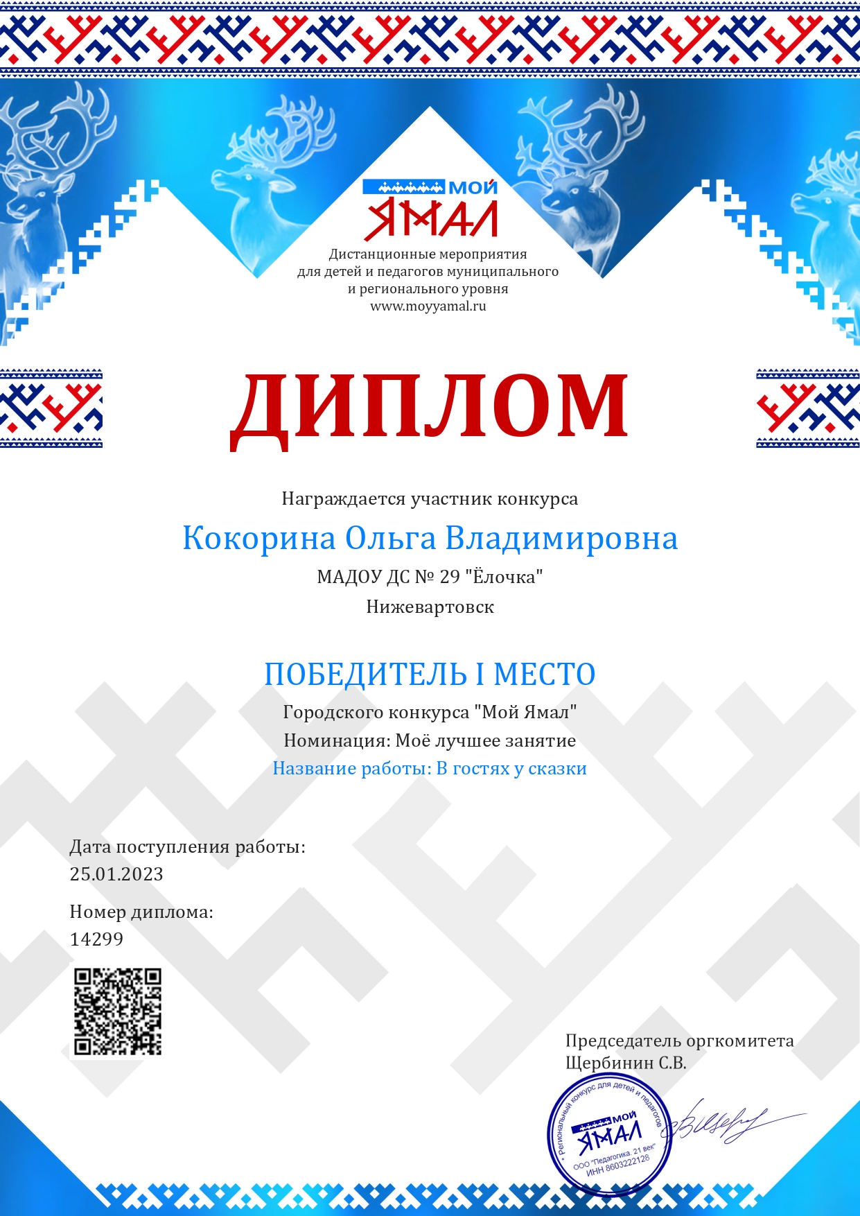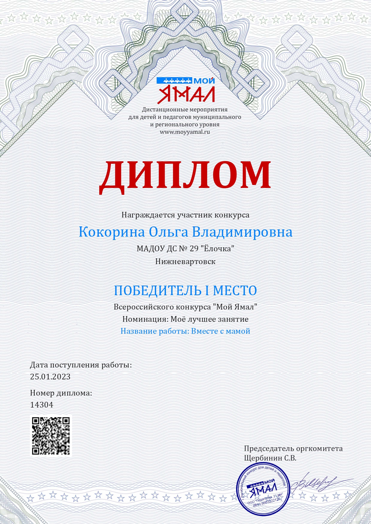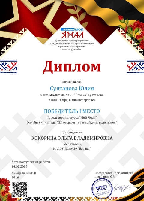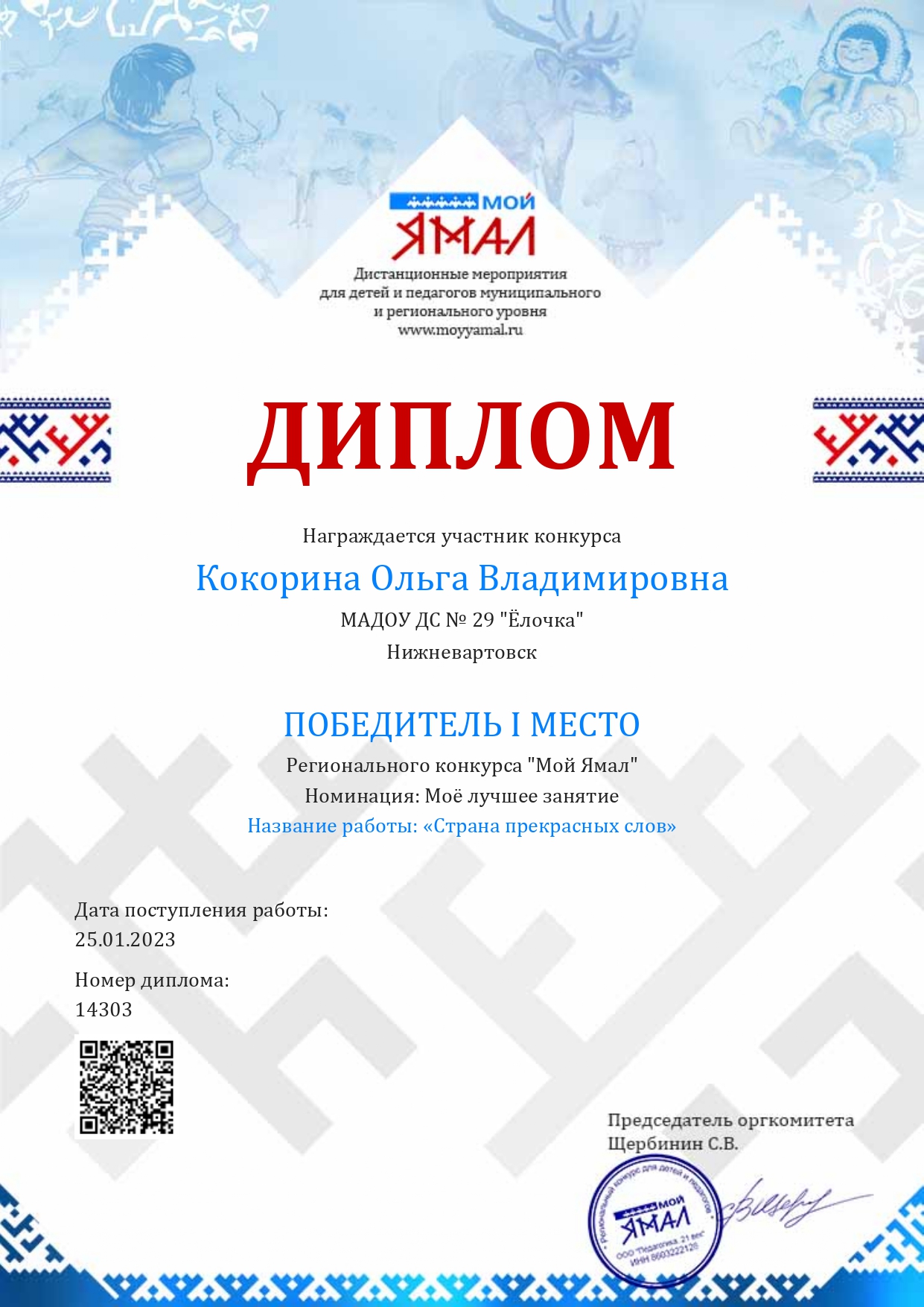 Диплом 1 место в Региональном конкурсе " Мой Ямал"