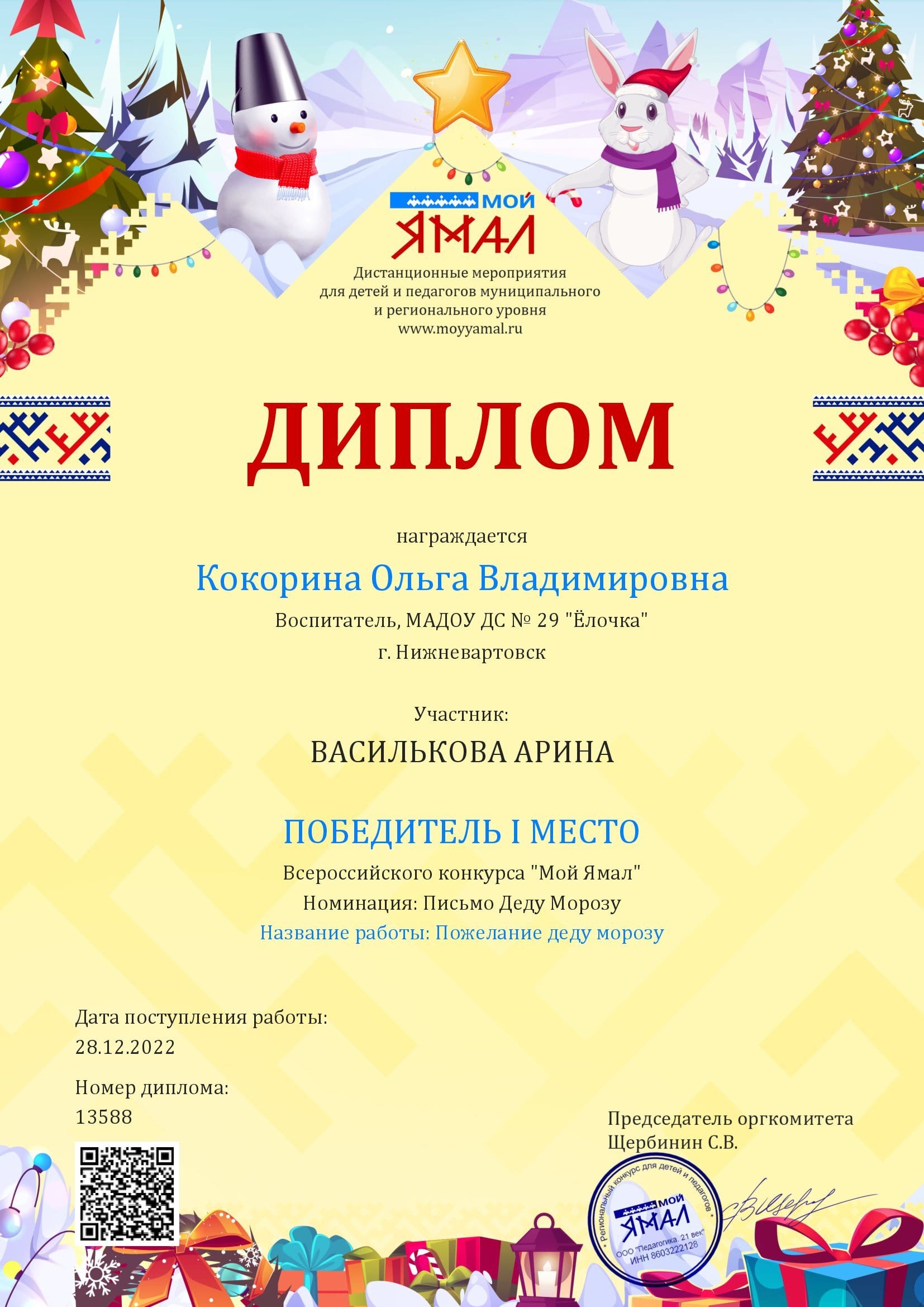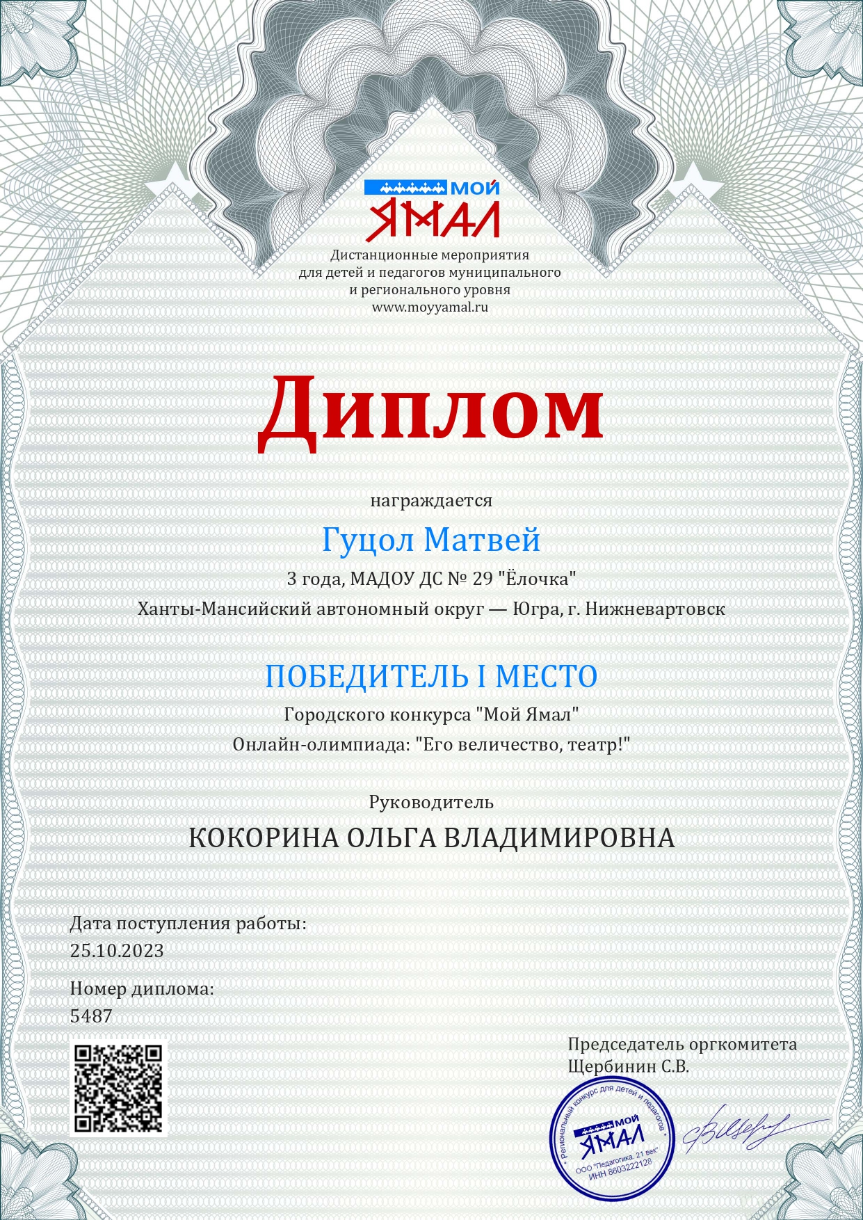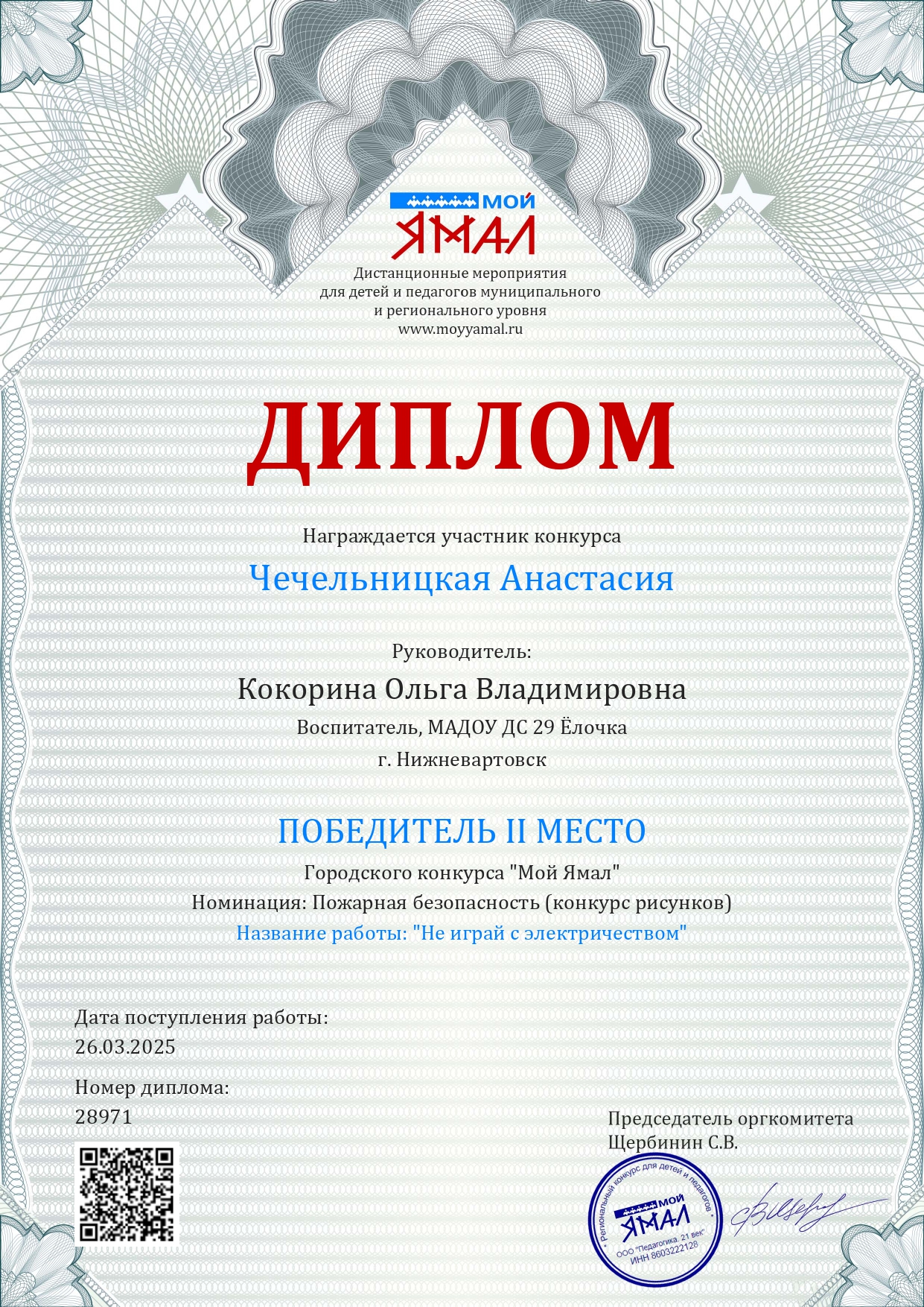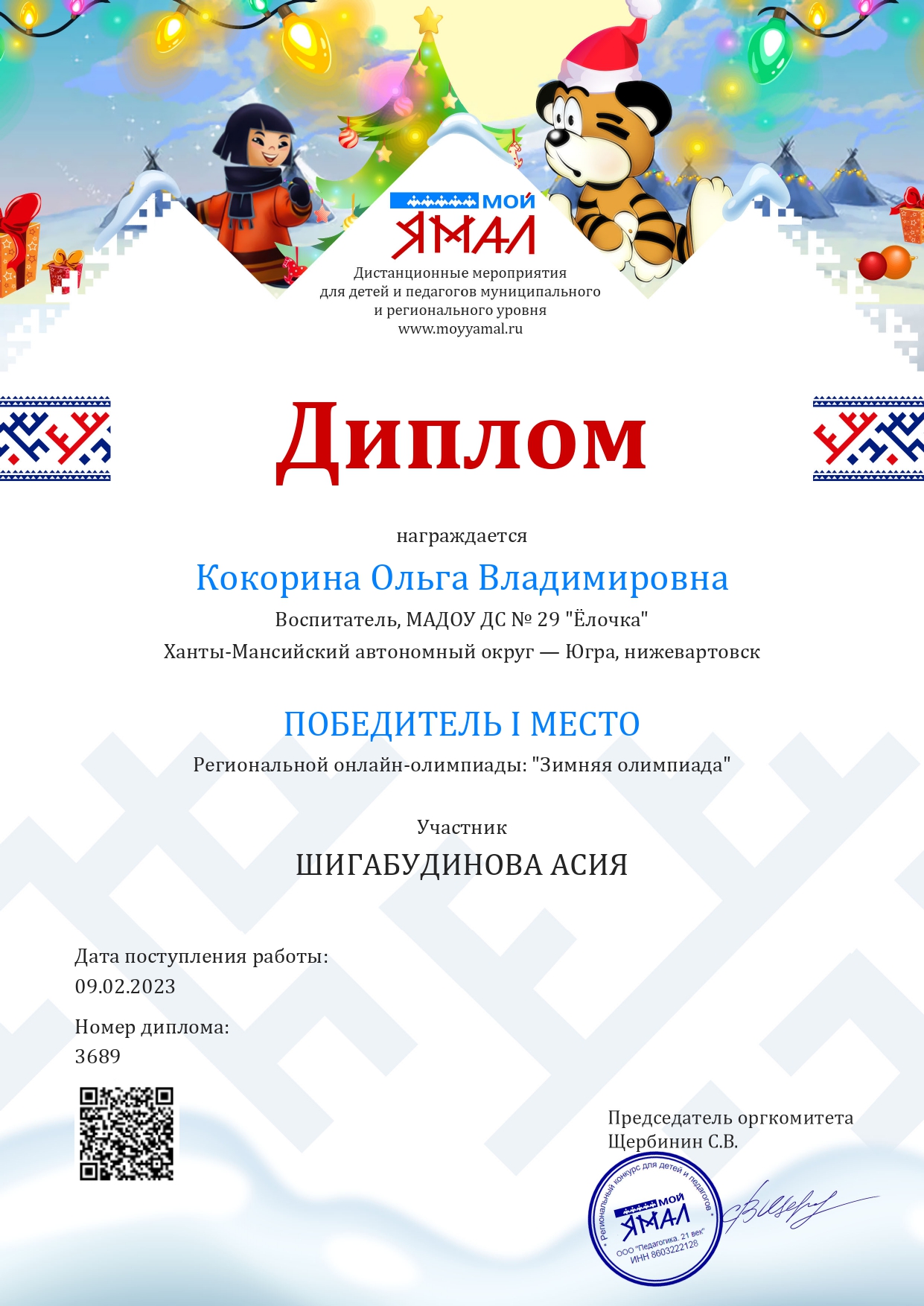 Диплом 1 место в Региональном конкурсе " Мой Ямал"
