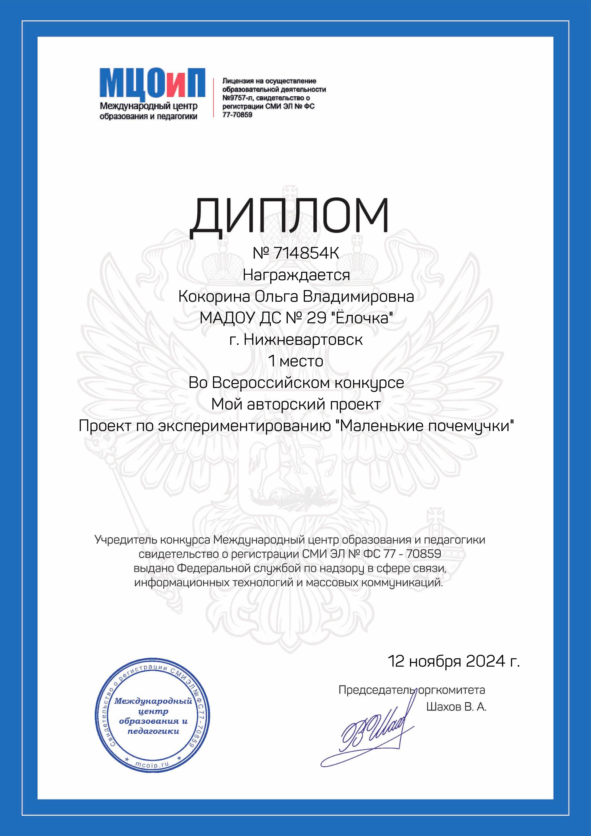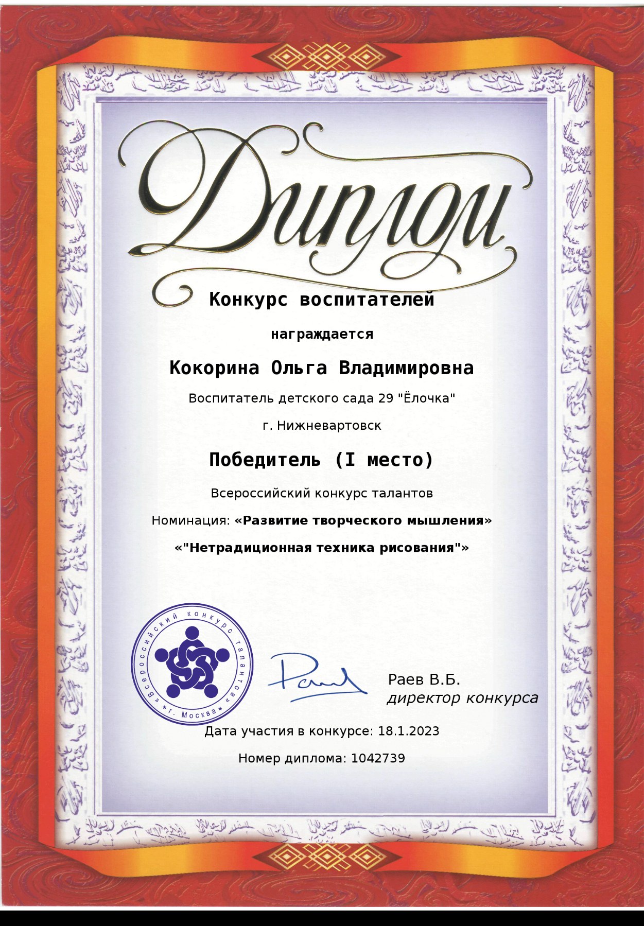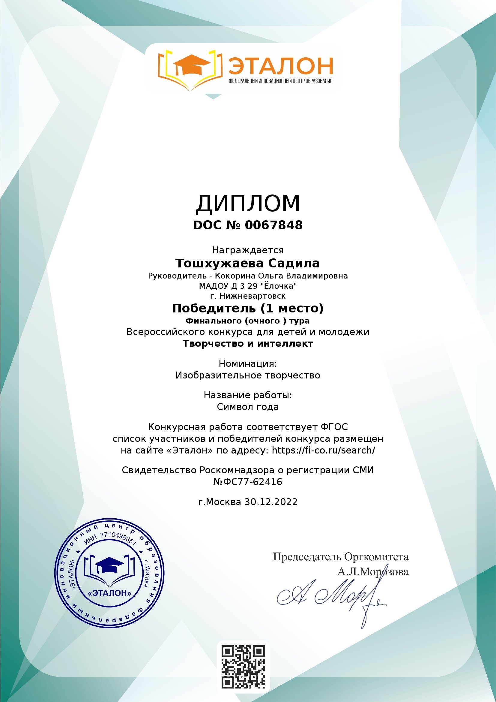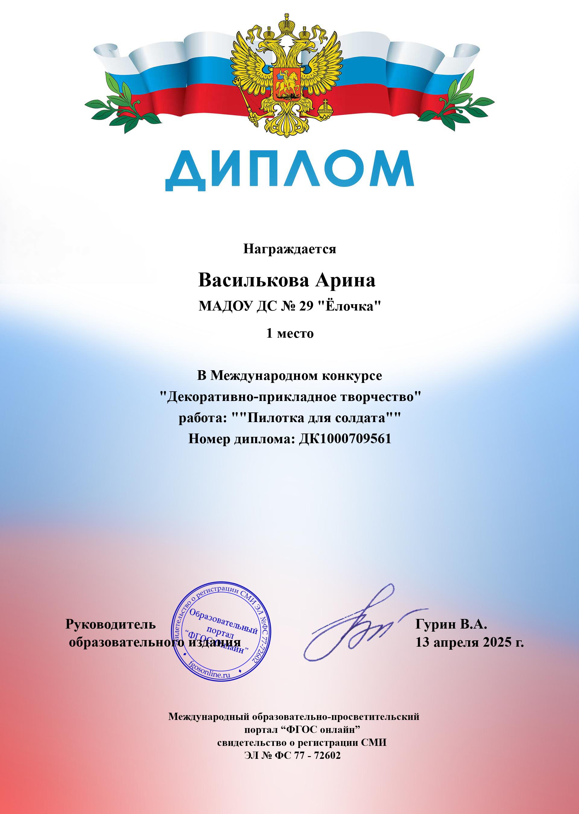 I место Всероссийского конкурса для детей и молодежи Творчество и интеллект