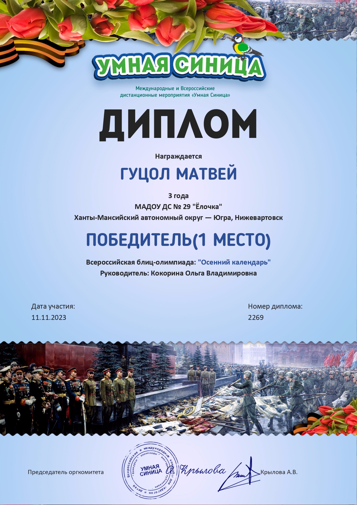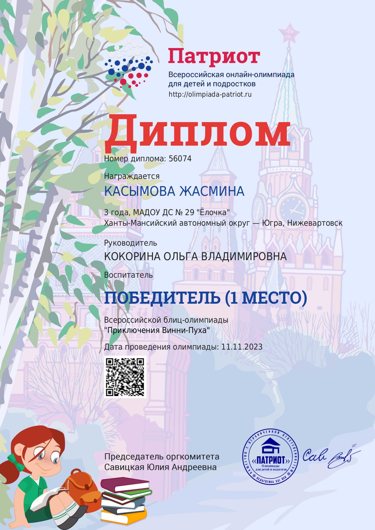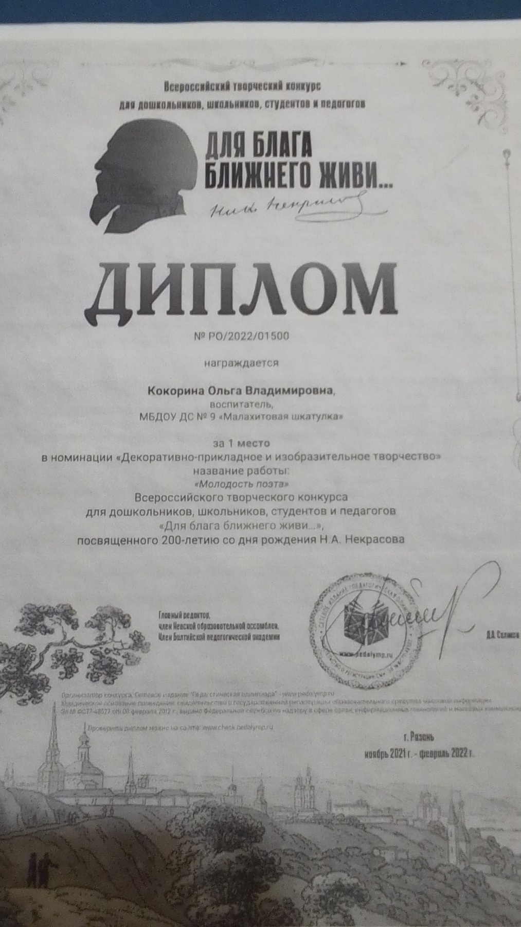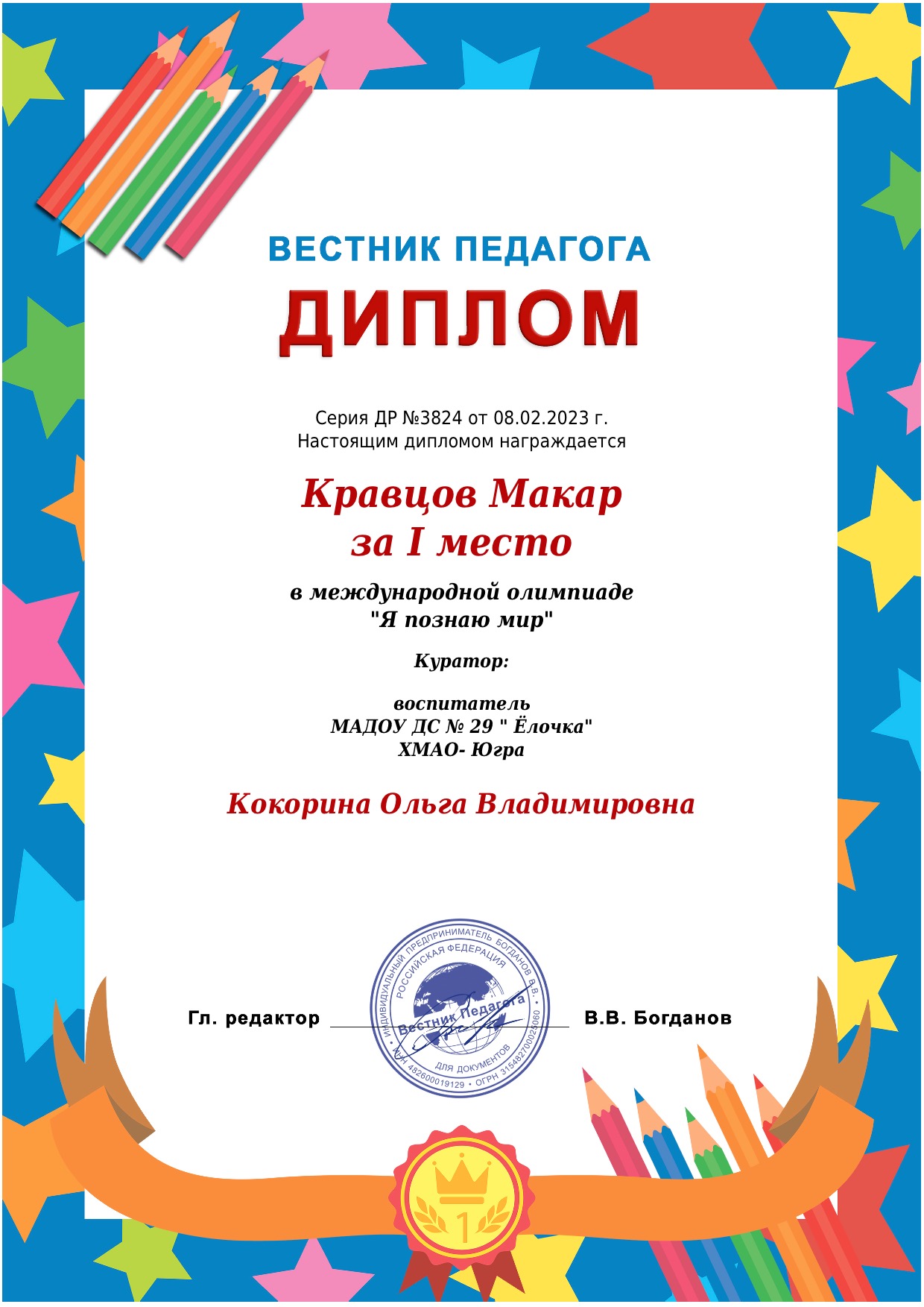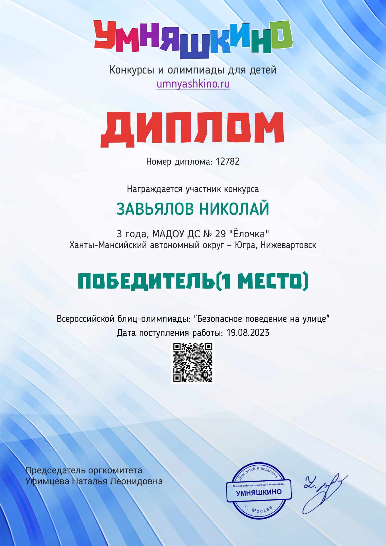 I место Всероссийского конкурса для детей и молодежи Творчество и интеллект