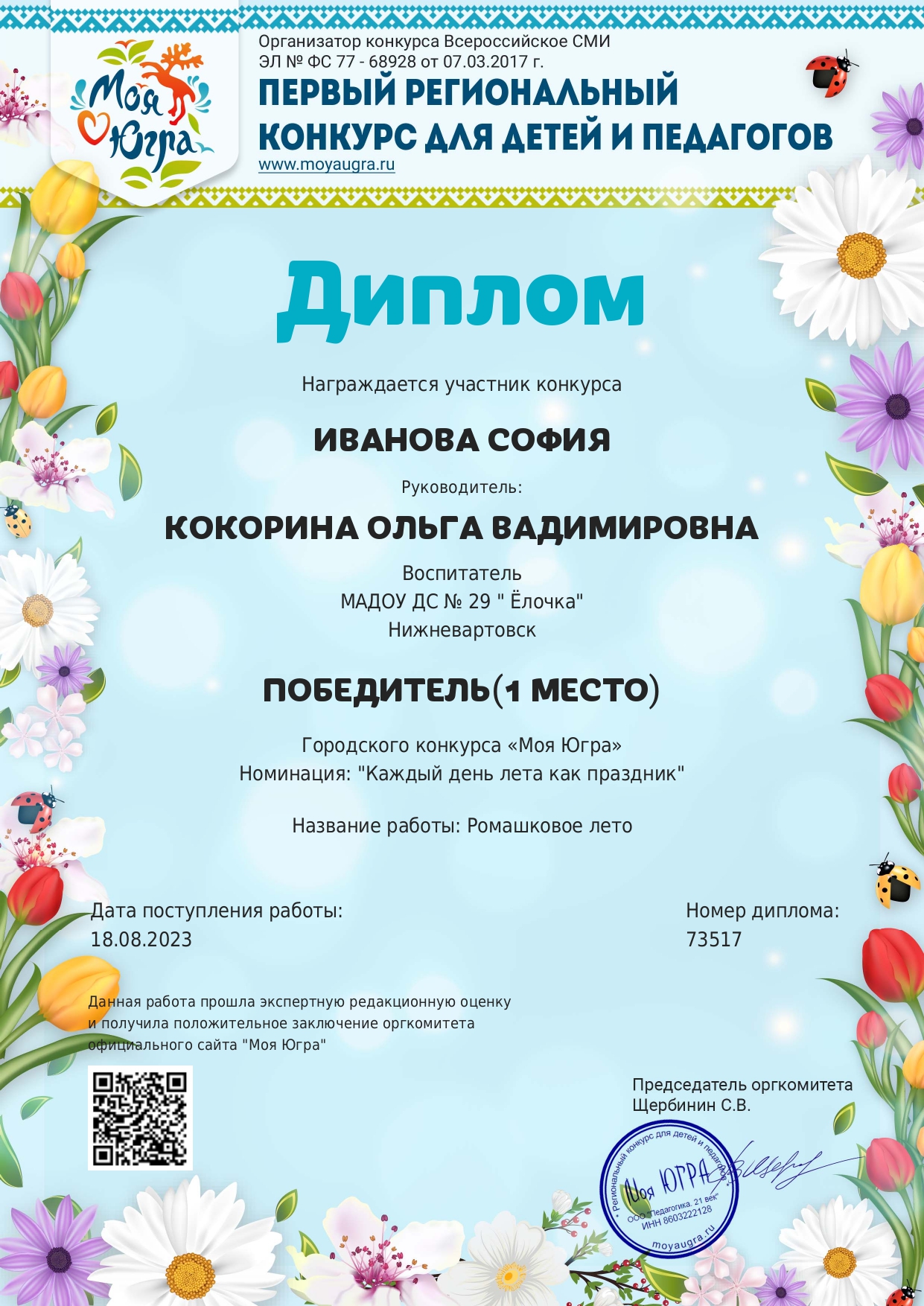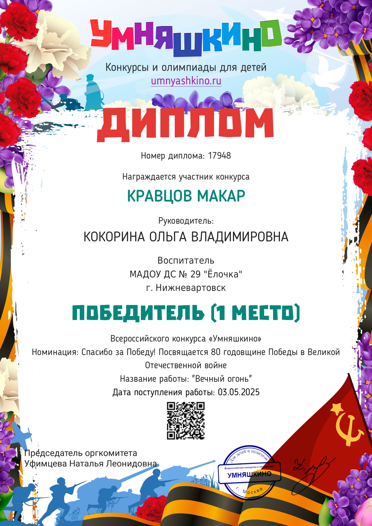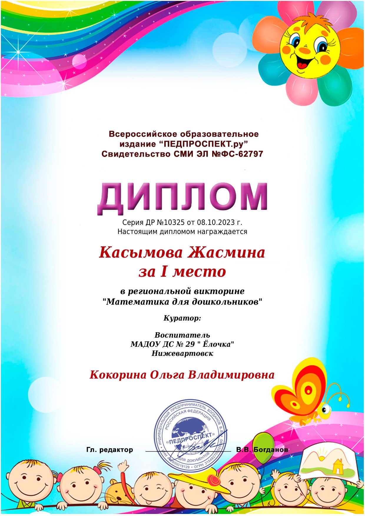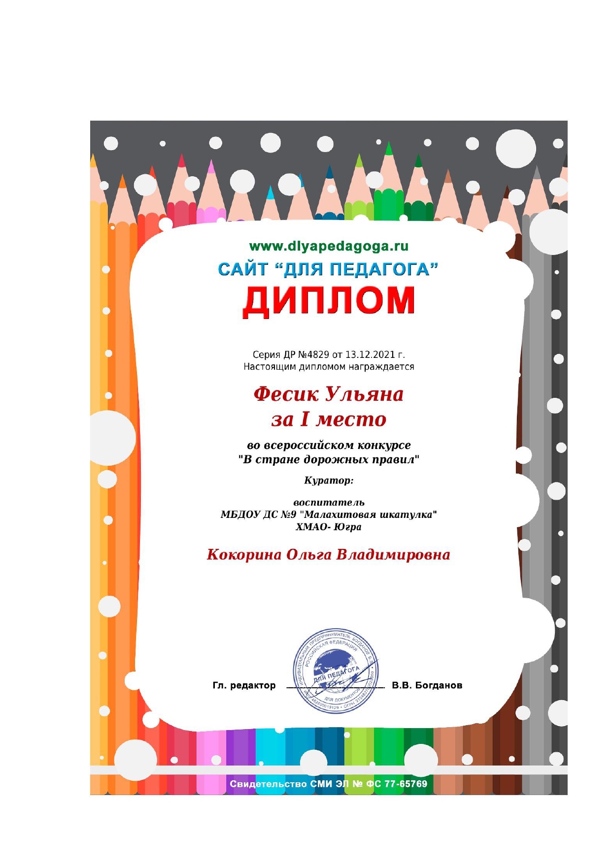 I место Всероссийского конкурса для детей и молодежи Творчество и интеллект