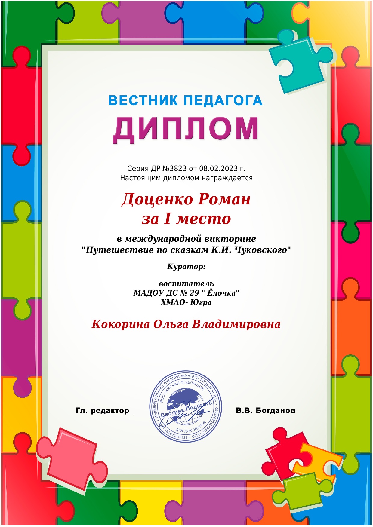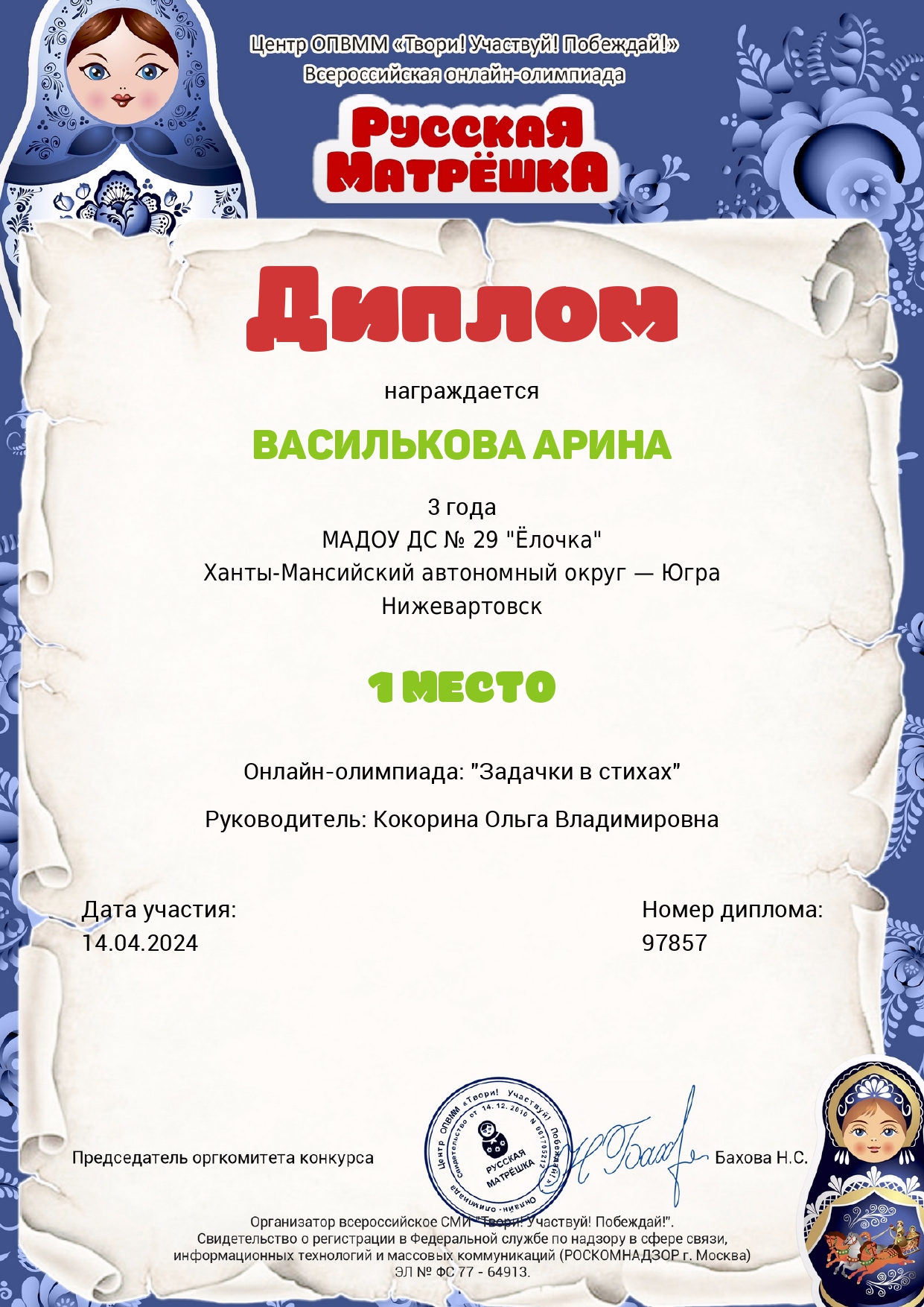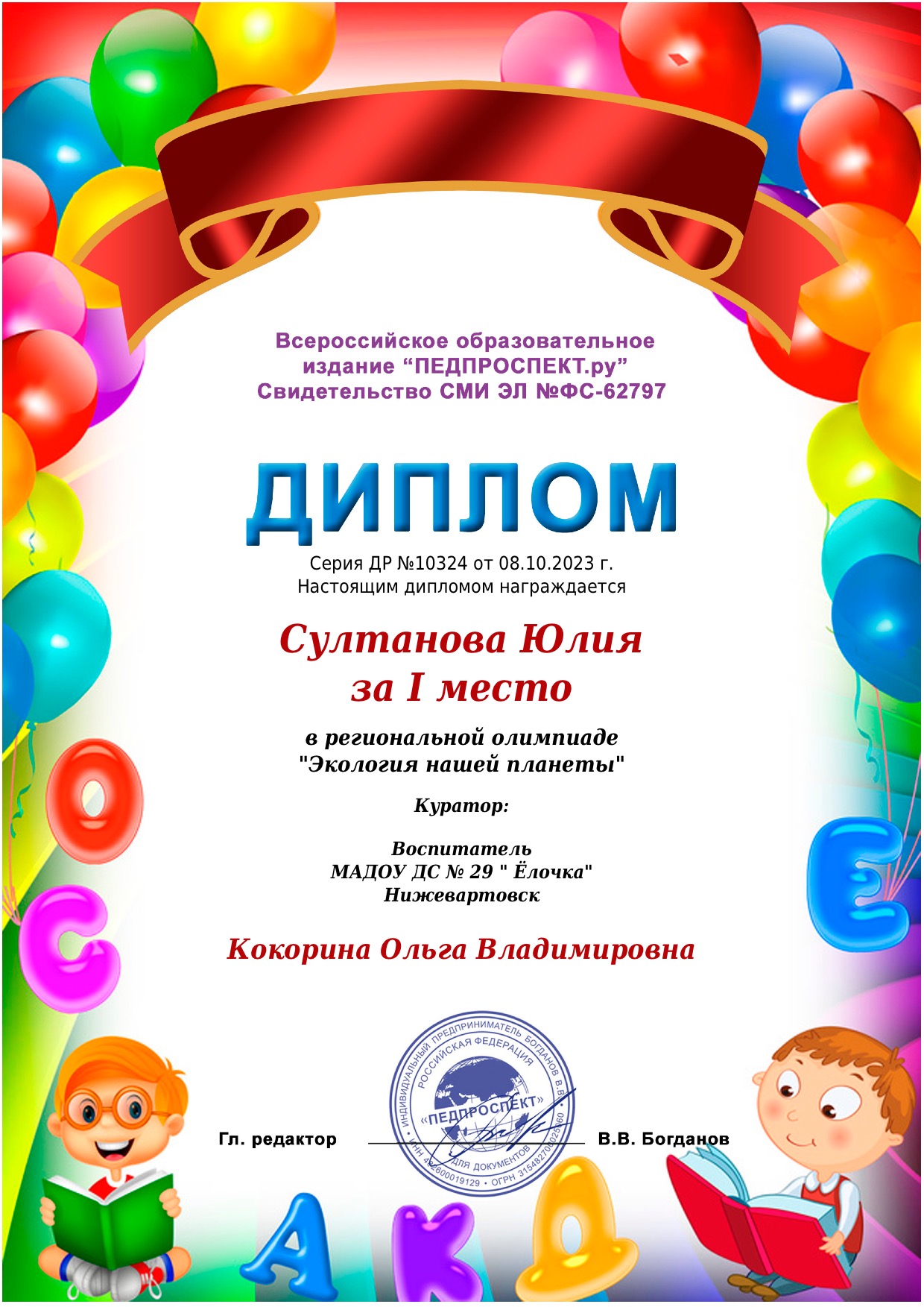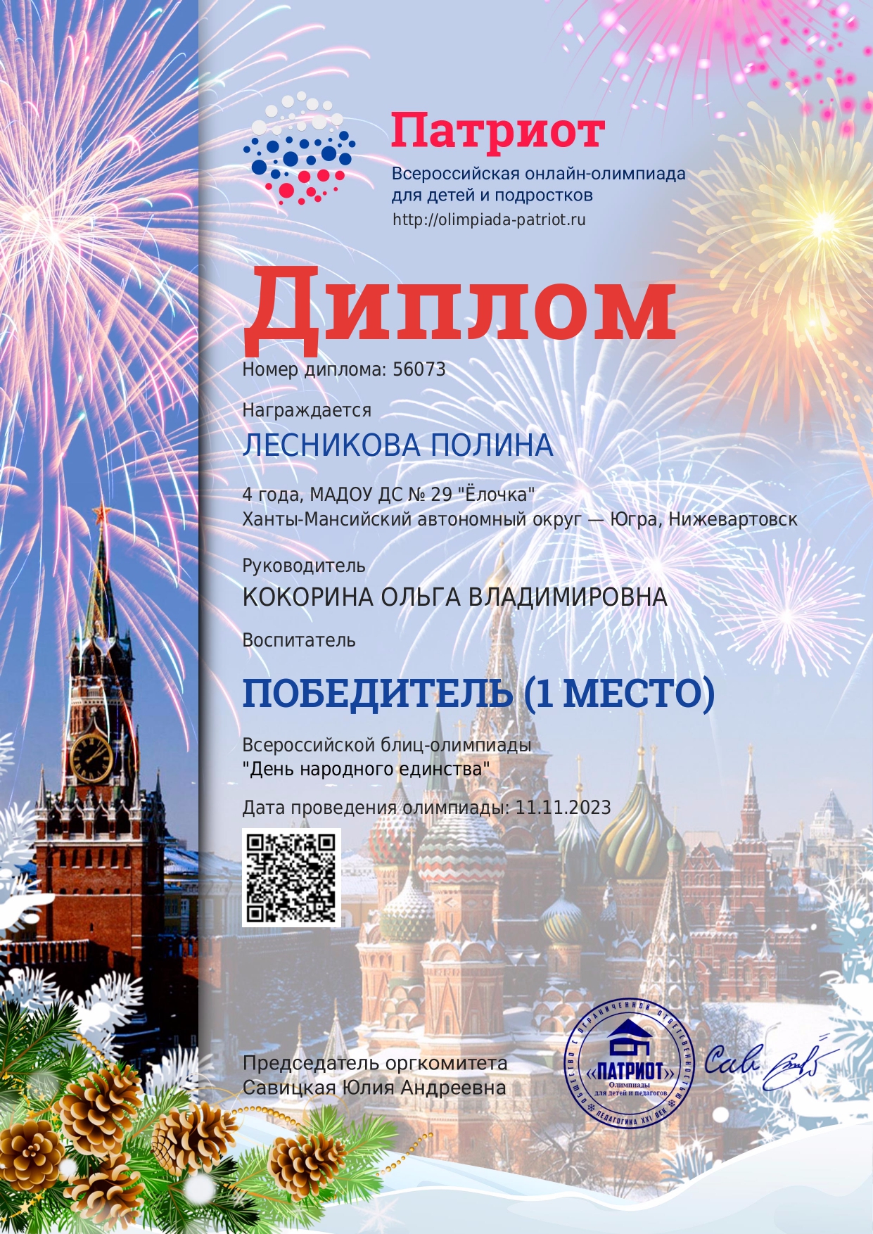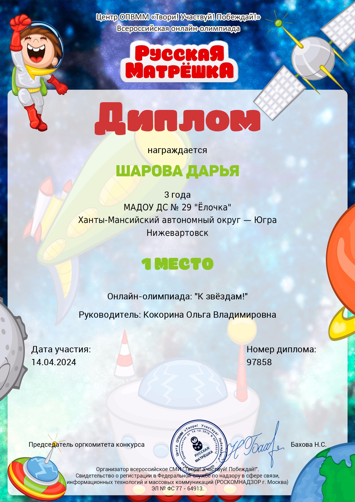 I место Всероссийского конкурса для детей и молодежи Творчество и интеллект