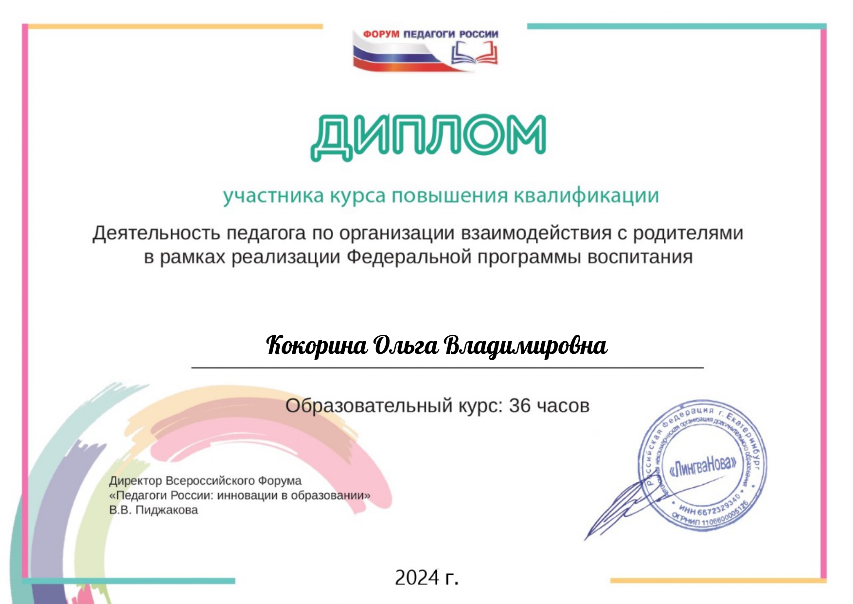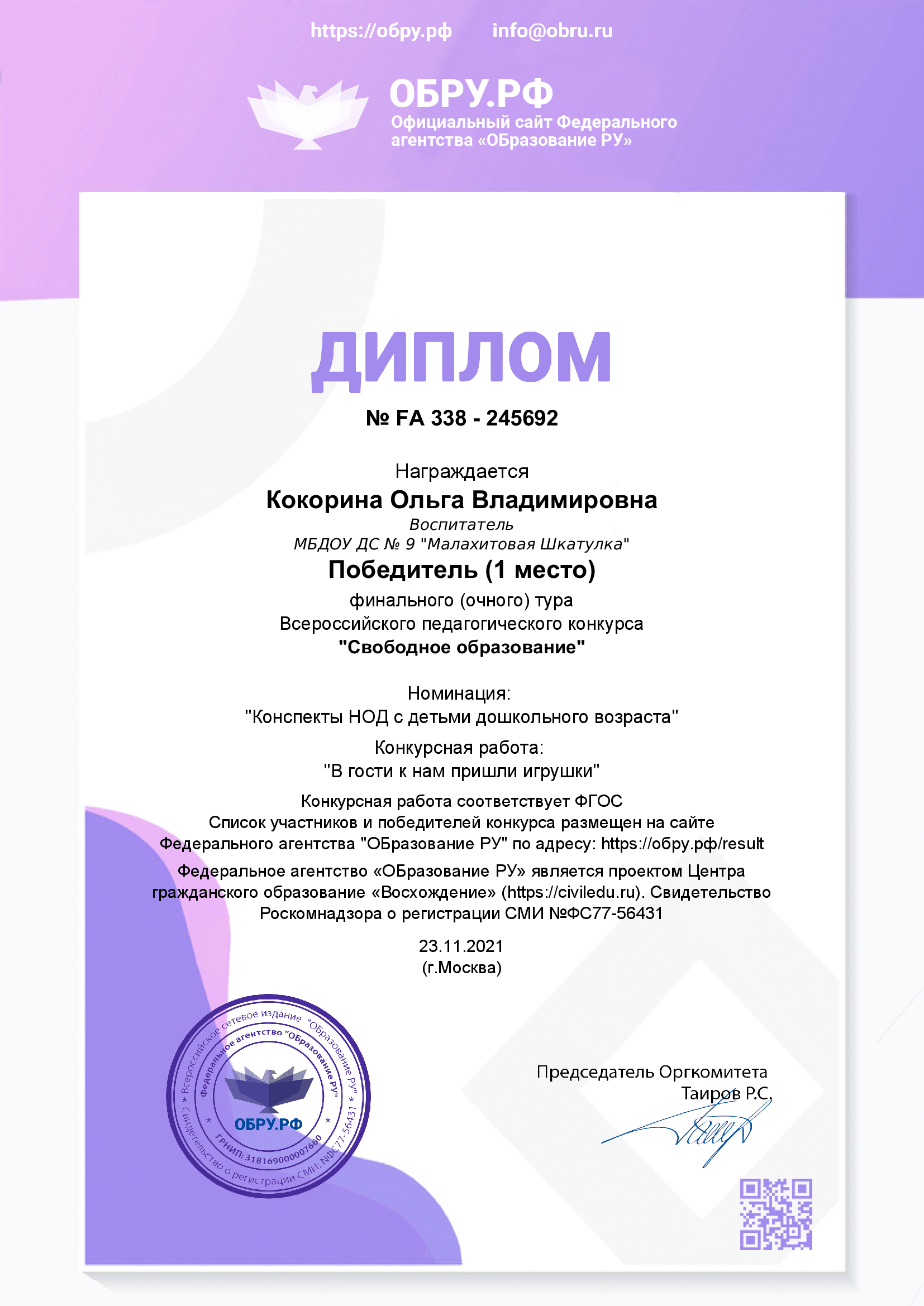 Диплом победителя финального тура Всероссийского педагогического конкурса "Свободное образование"