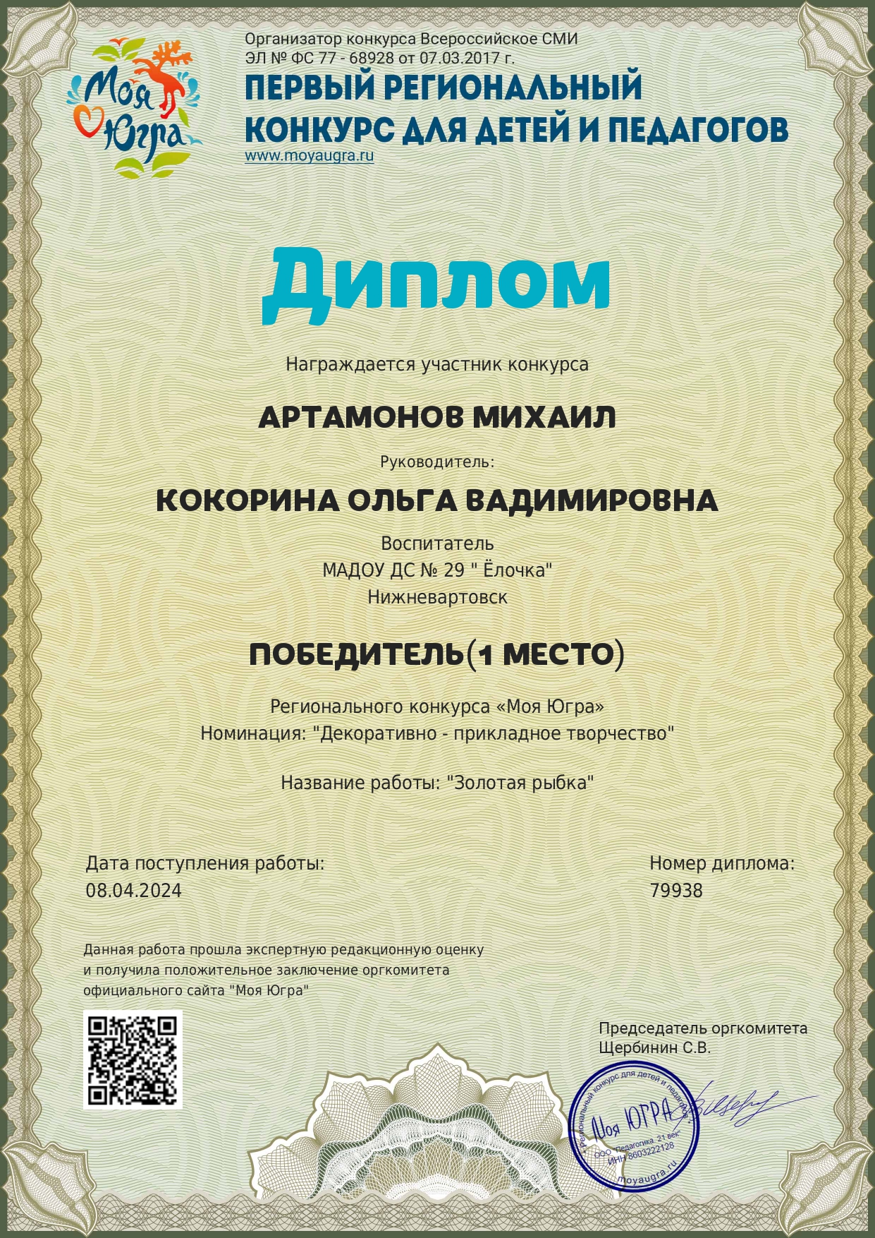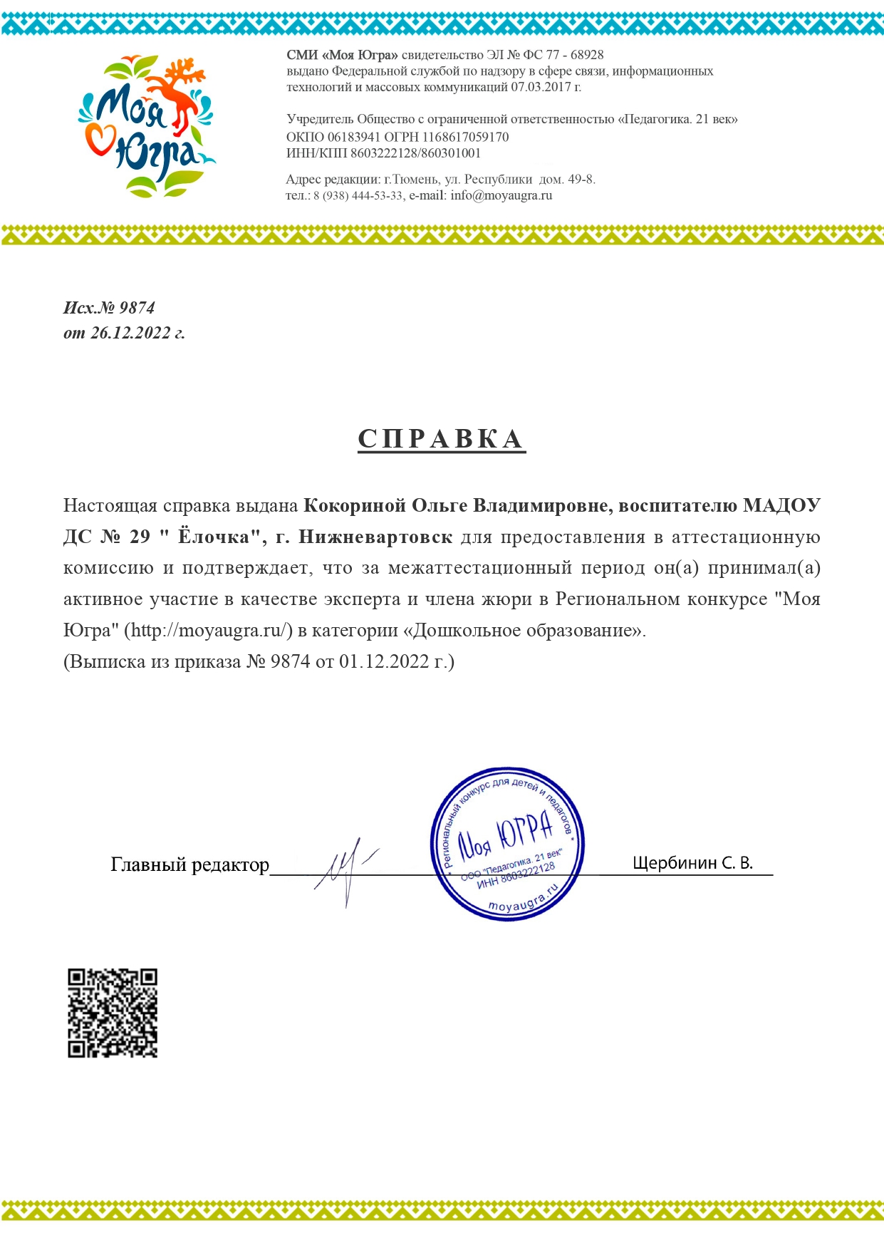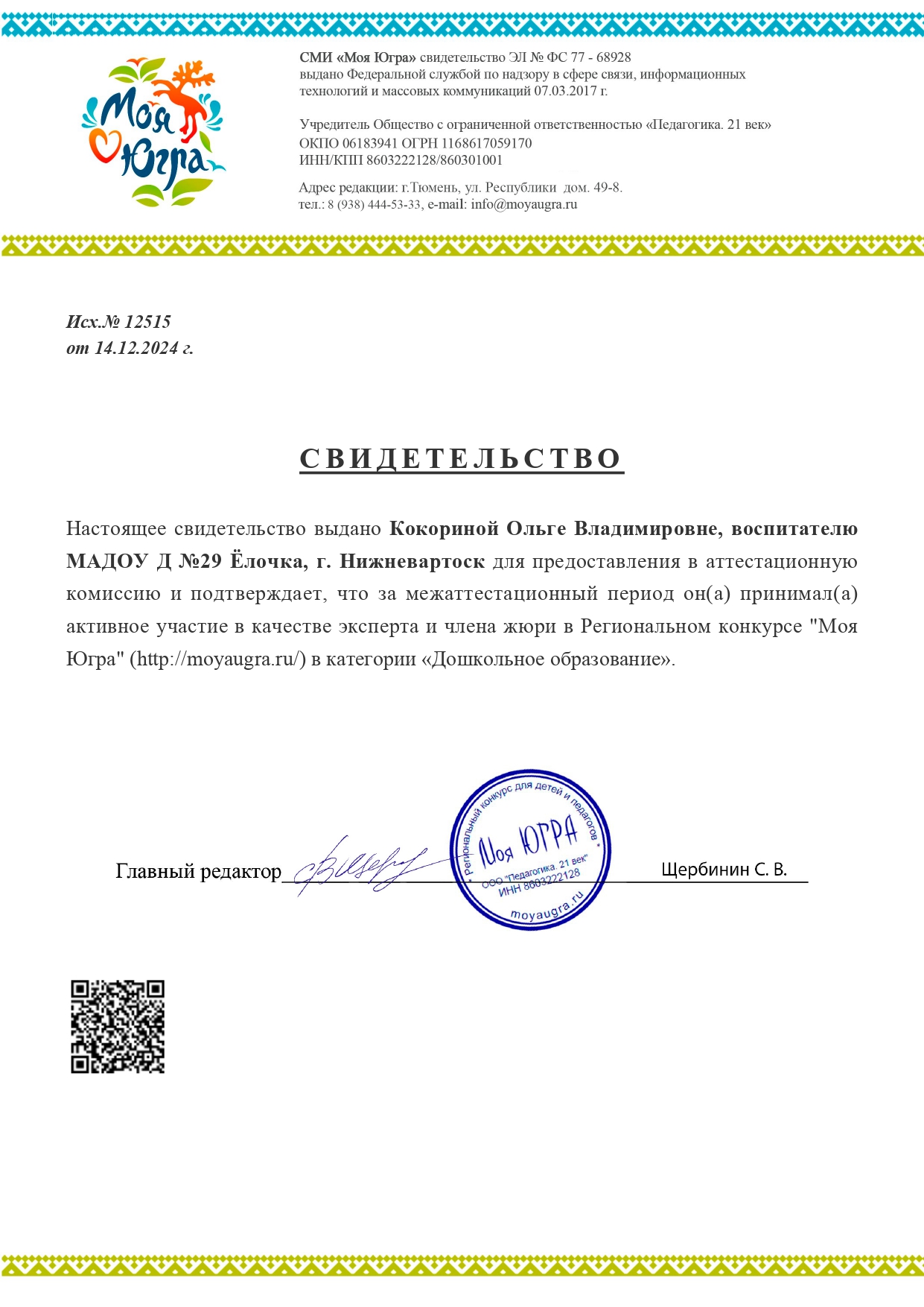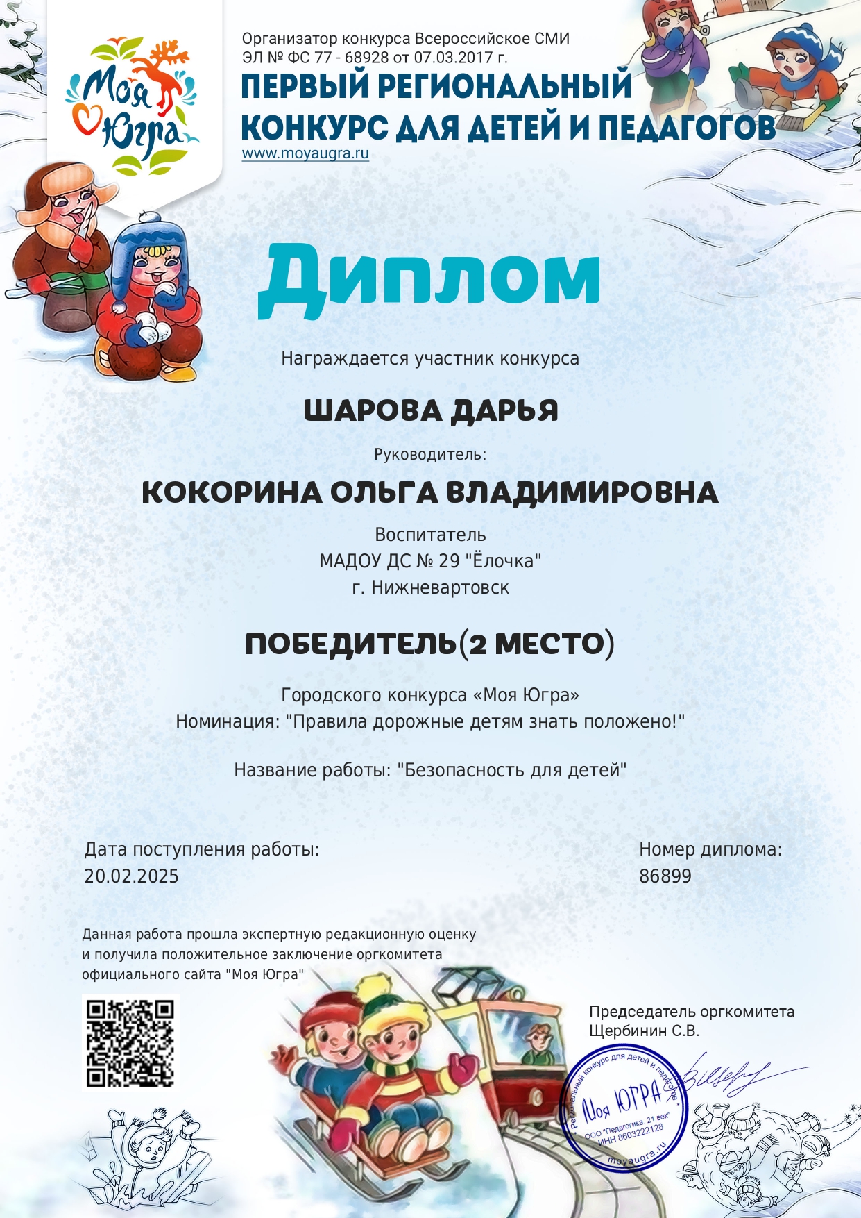 Свидетельство за активное участие в качестве эксперта и члена жюри в региональном конкурсе "Моя Югра"