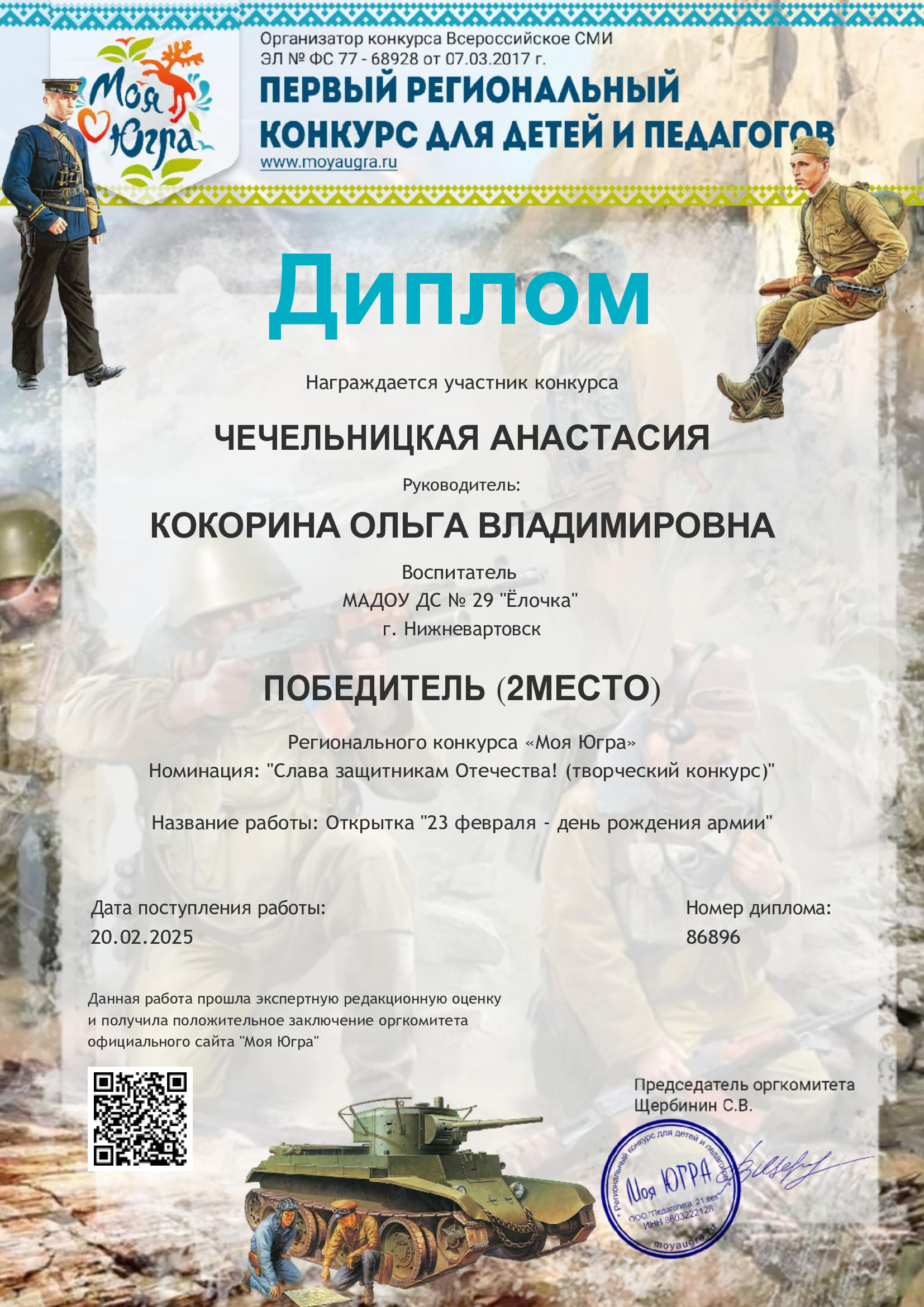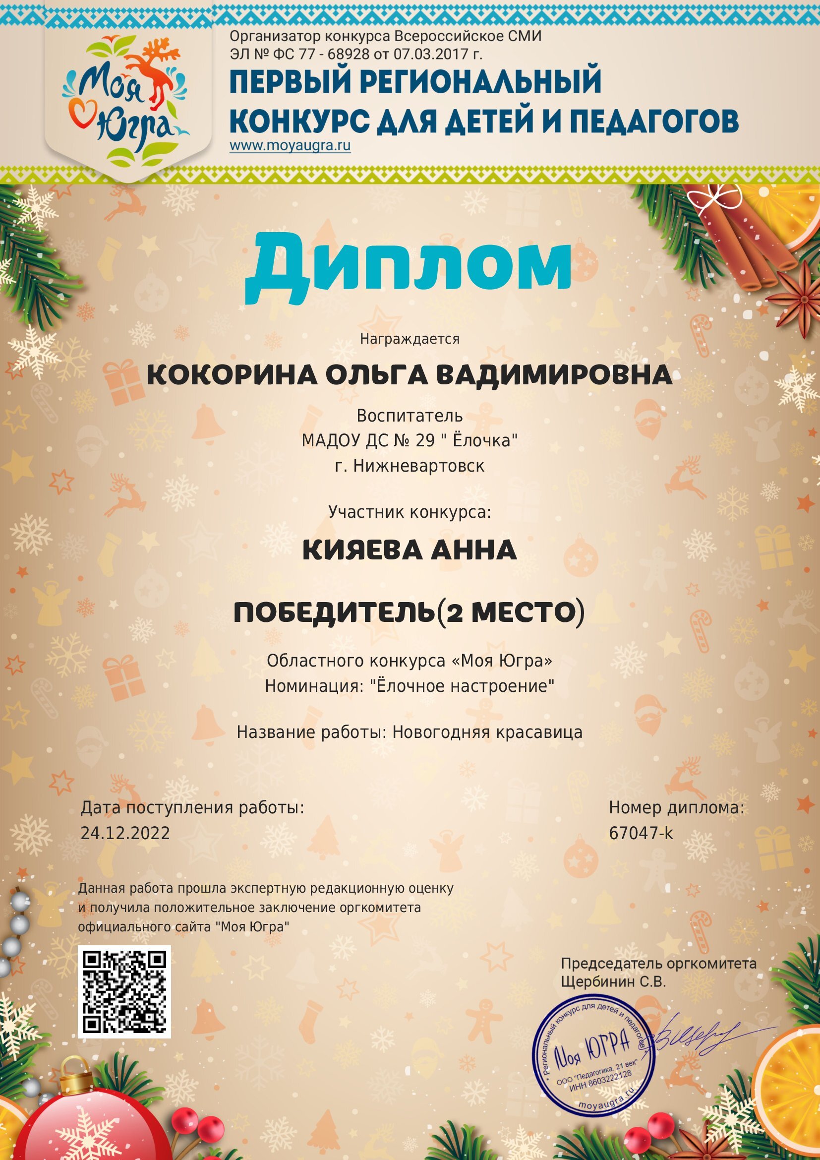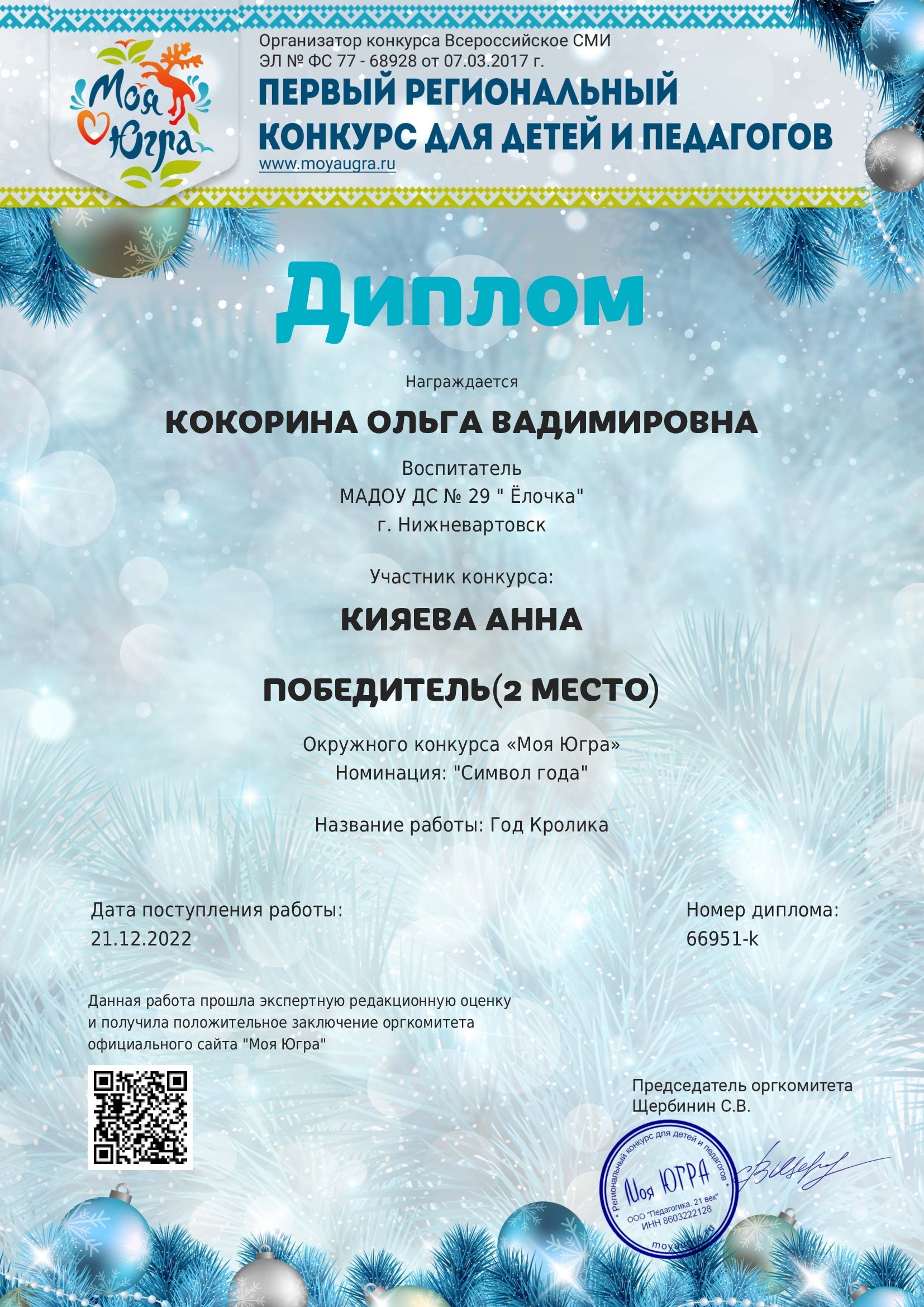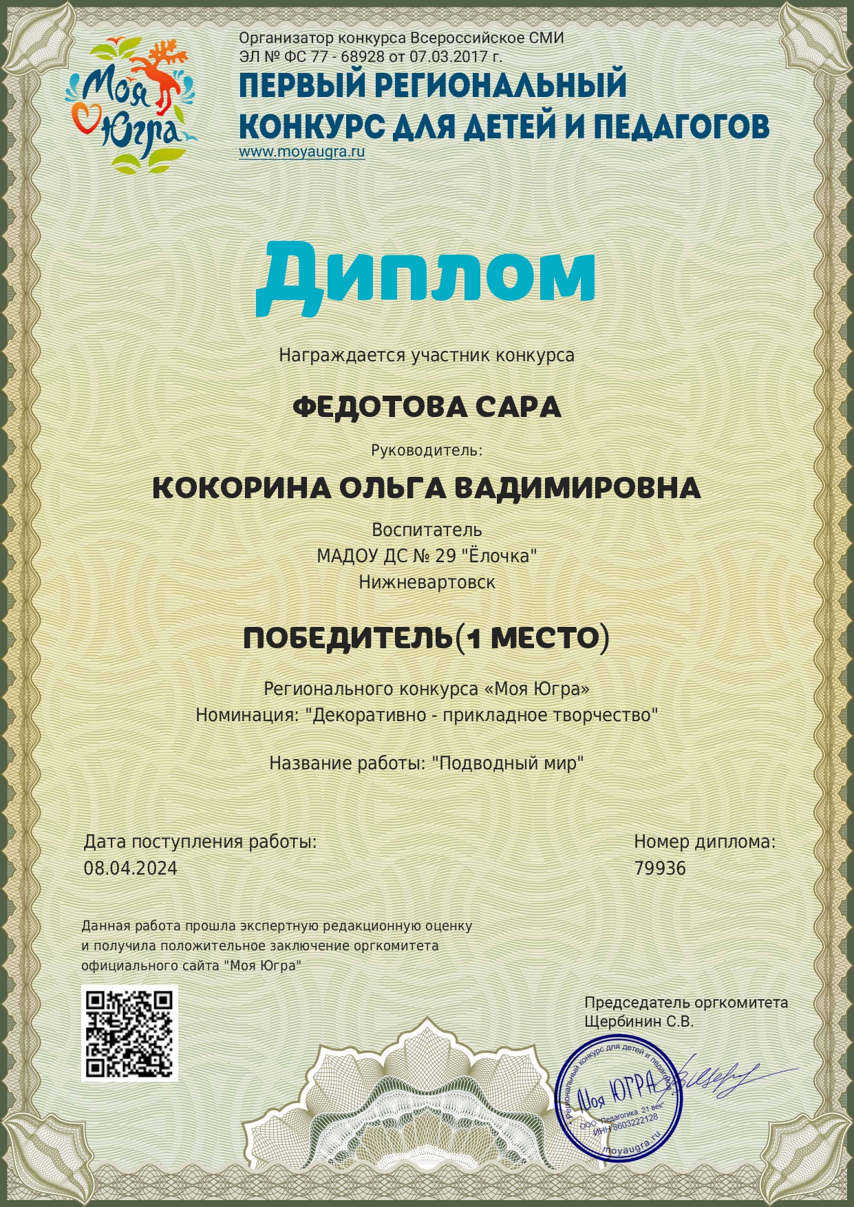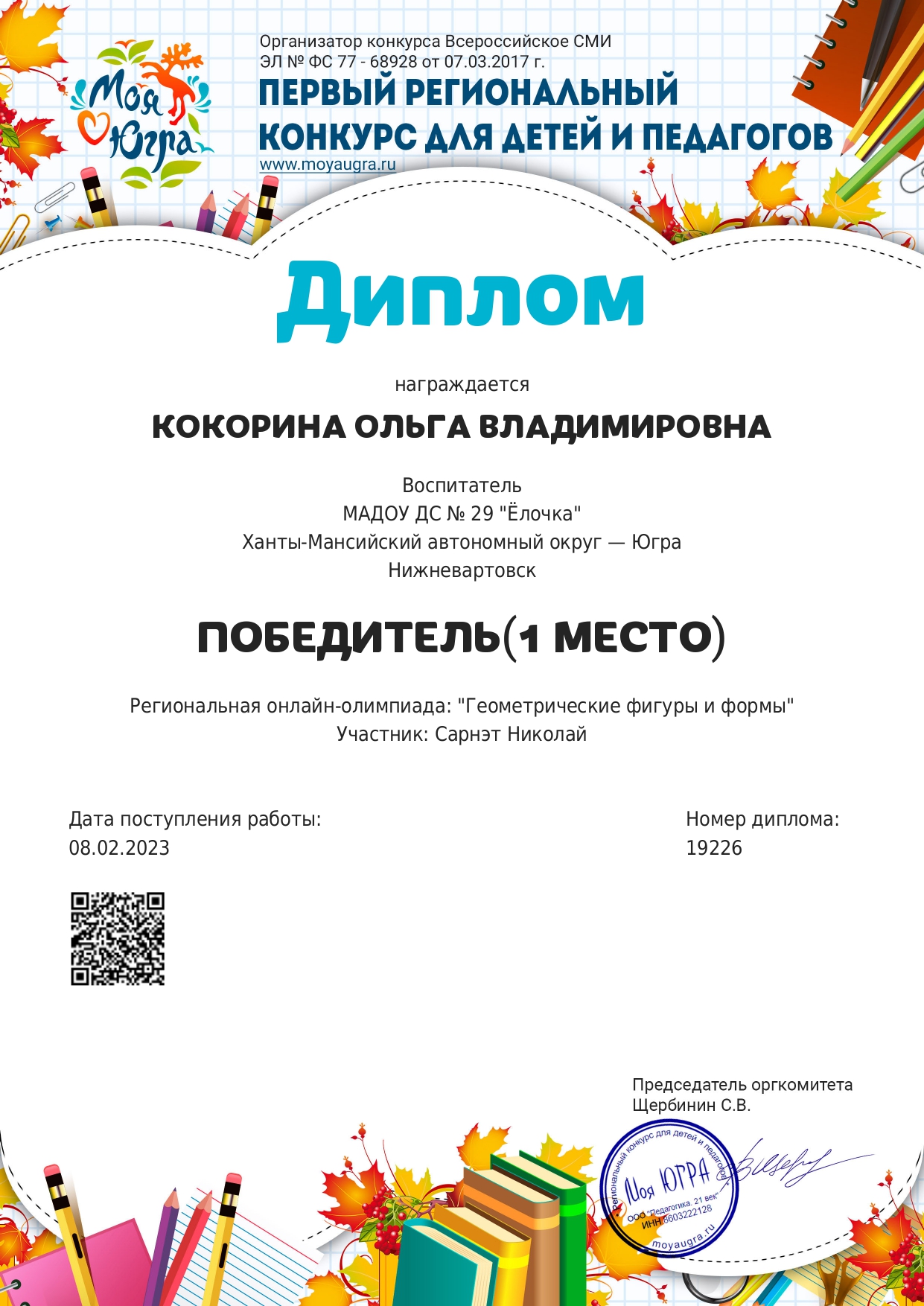 Свидетельство за активное участие в качестве эксперта и члена жюри в региональном конкурсе "Моя Югра"
