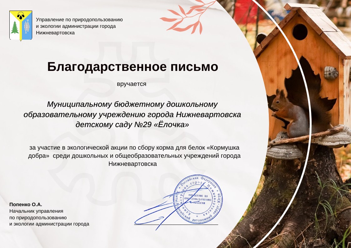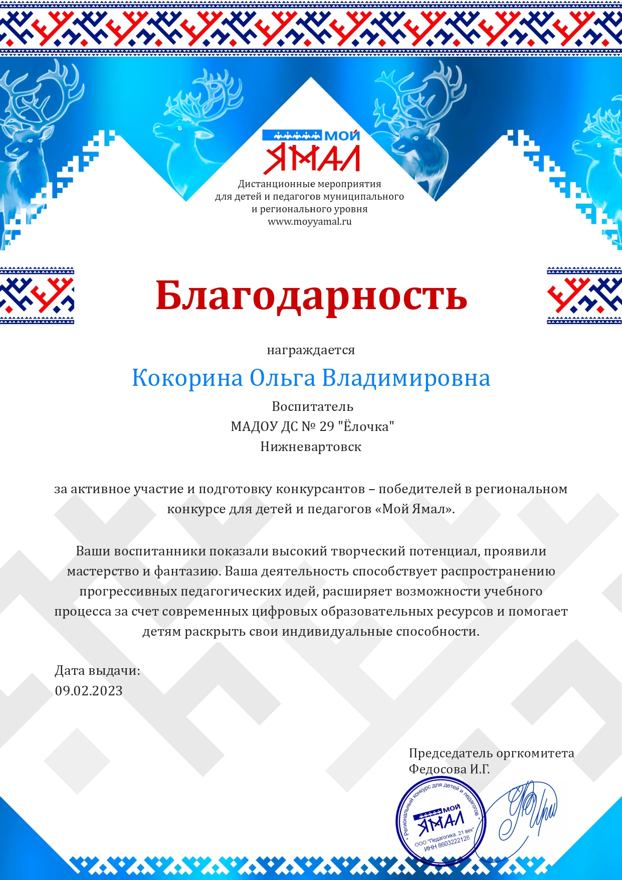 Благодарственное письмо за активное участие в конкурсах "Мой Ямал"