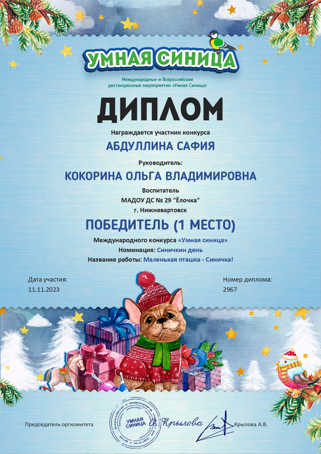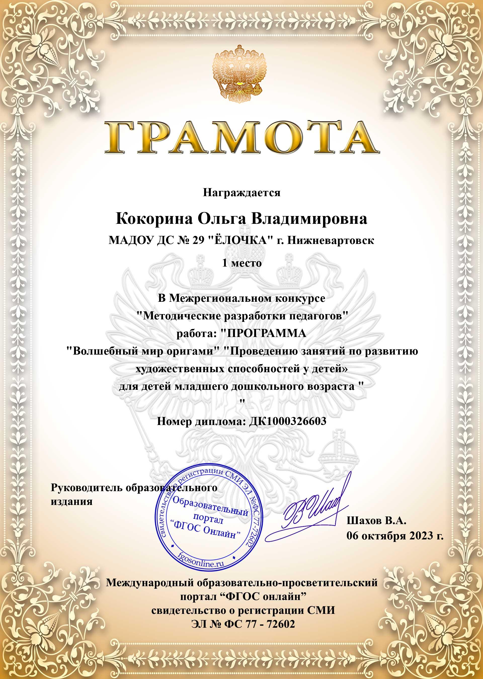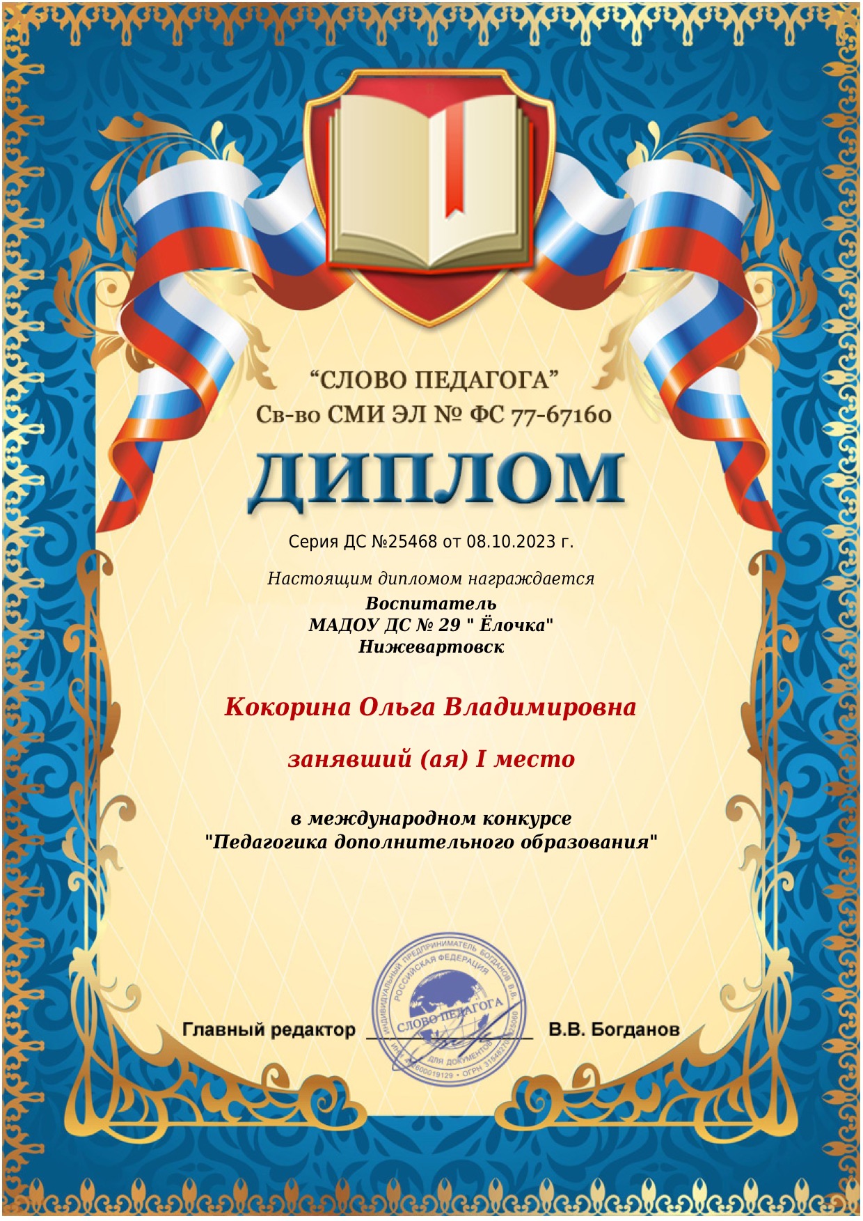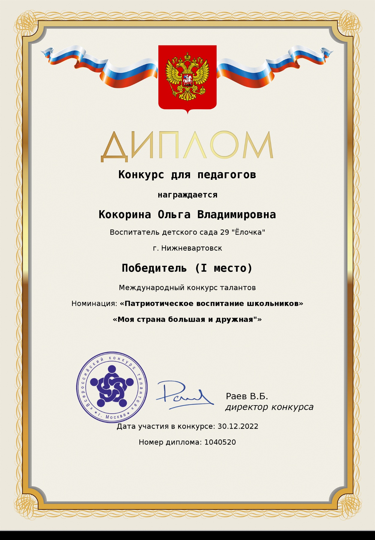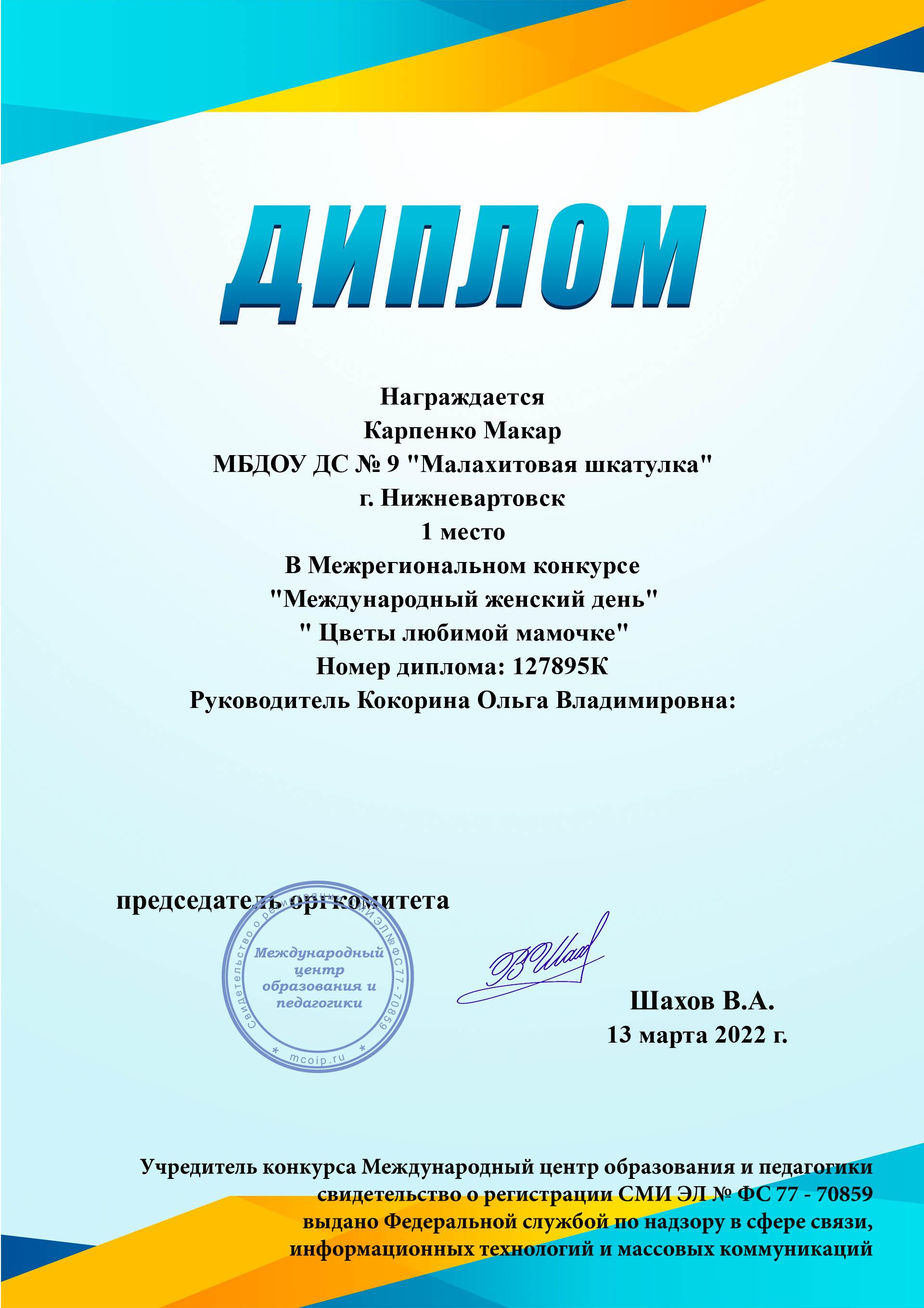 Диплом победителя 1 место в международном конкурсе педагогов.