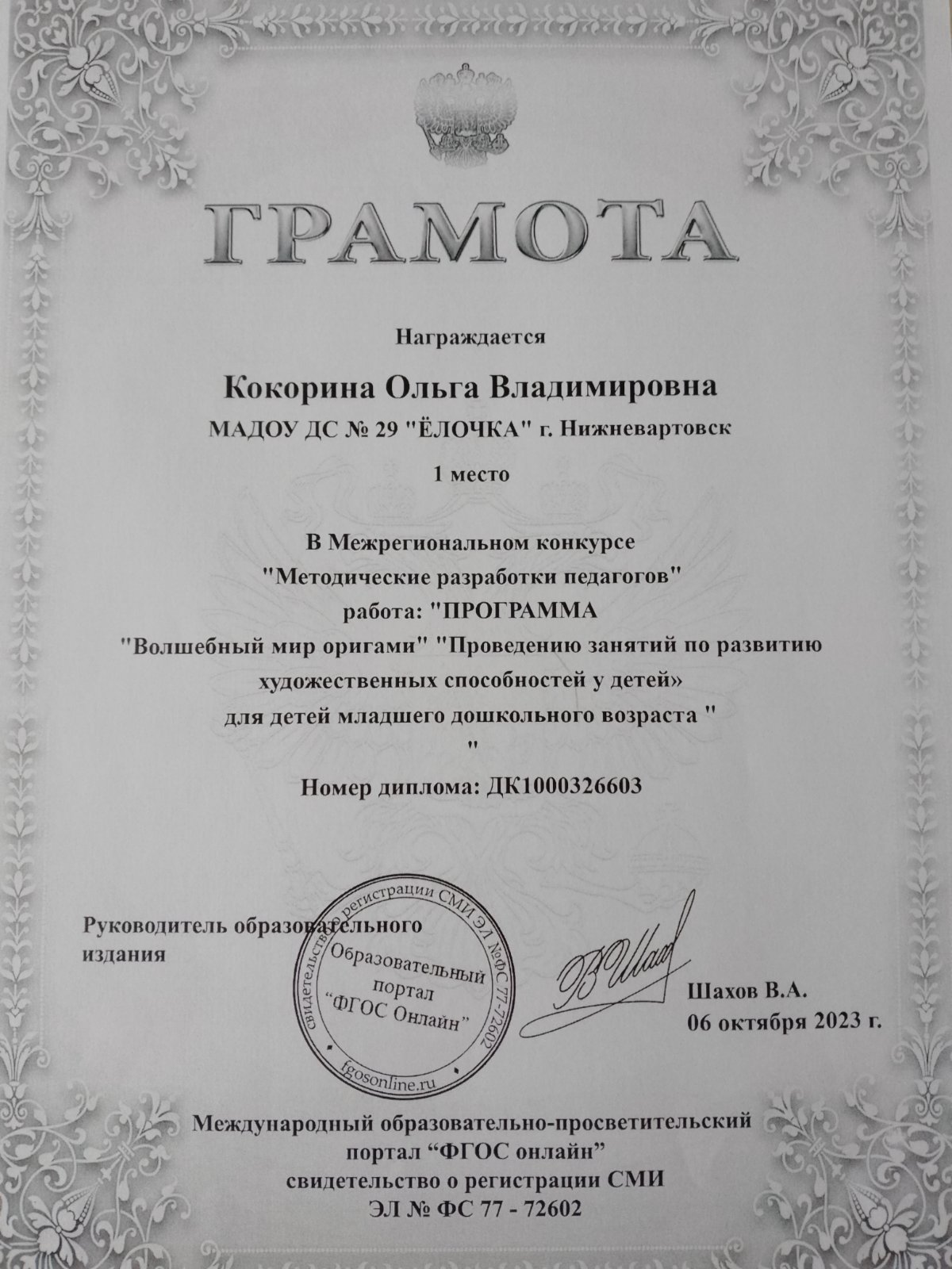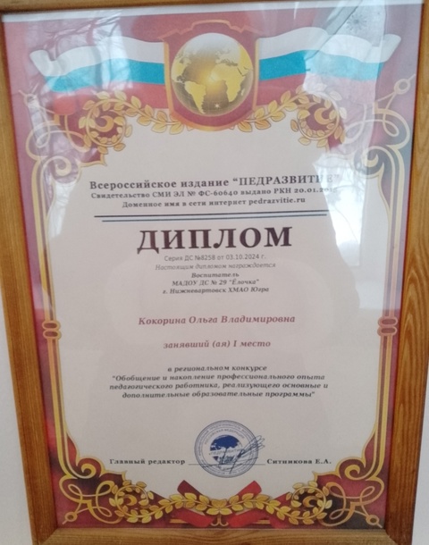 Диплом победителя "Здоровьесберегающие технологии в дошкольном образовании"