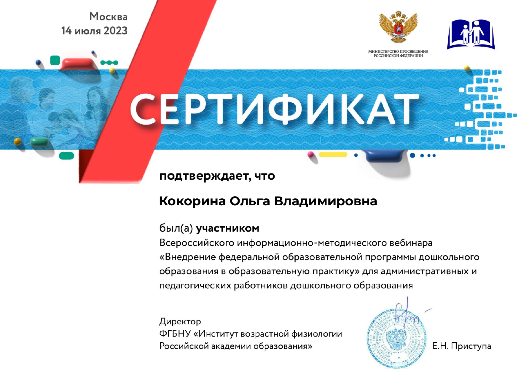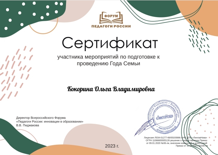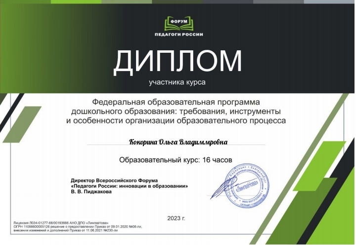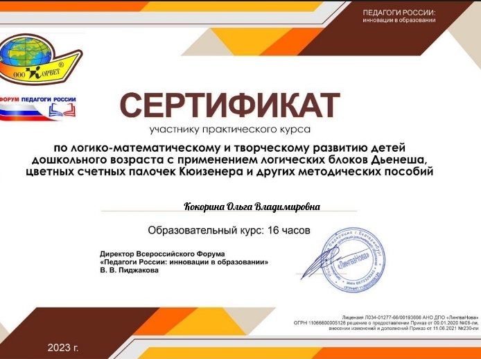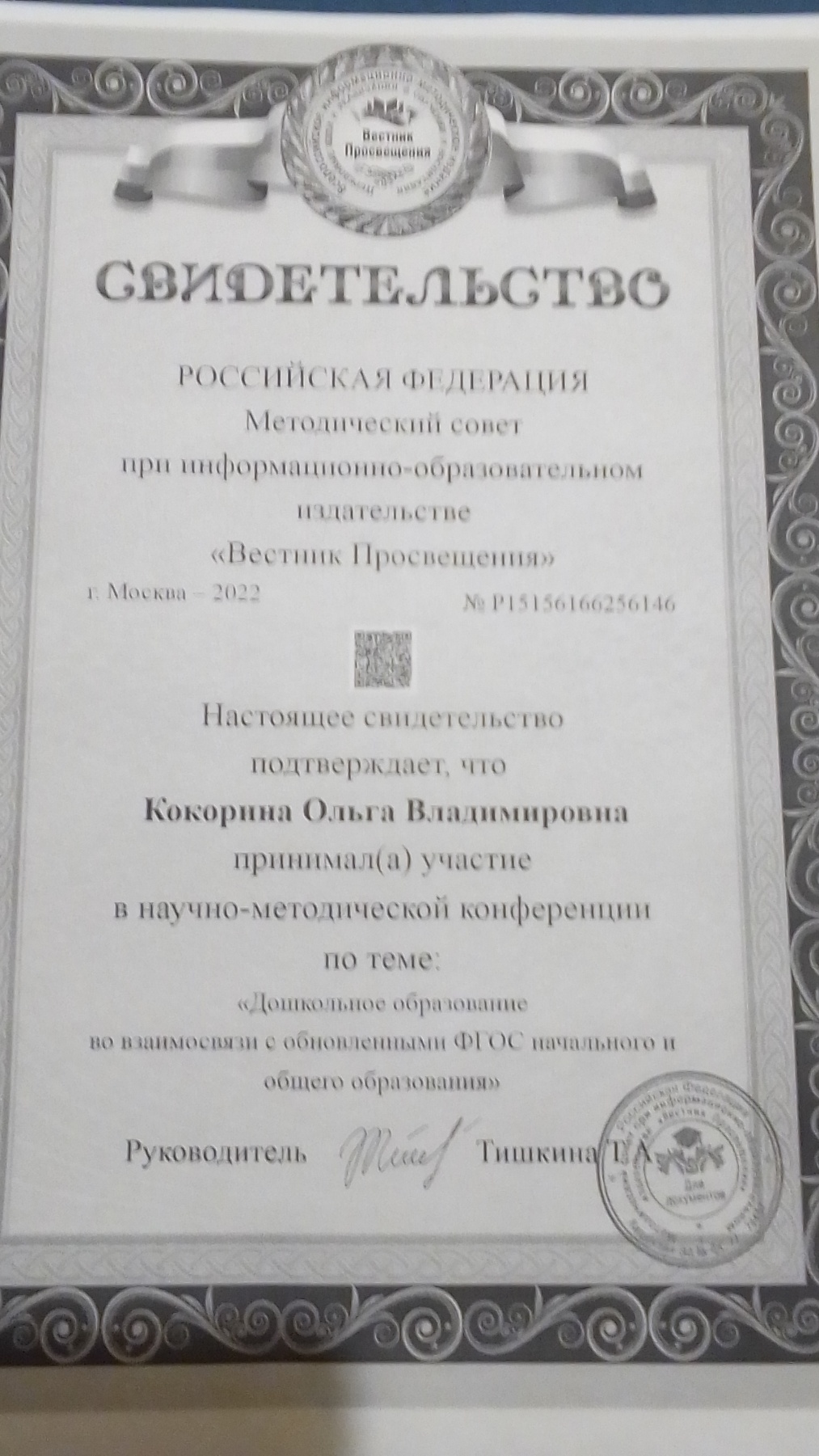 Свидетельство по теме "Дошкольное образование во в взаимосвязи с обновленными ФГОС начального и общего образования"