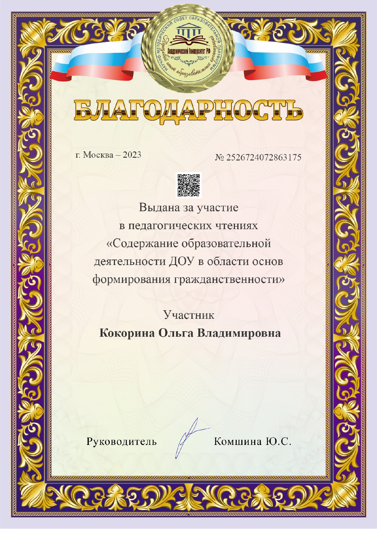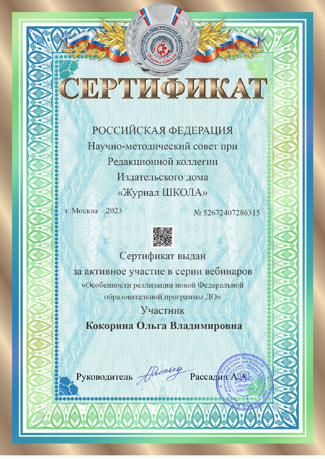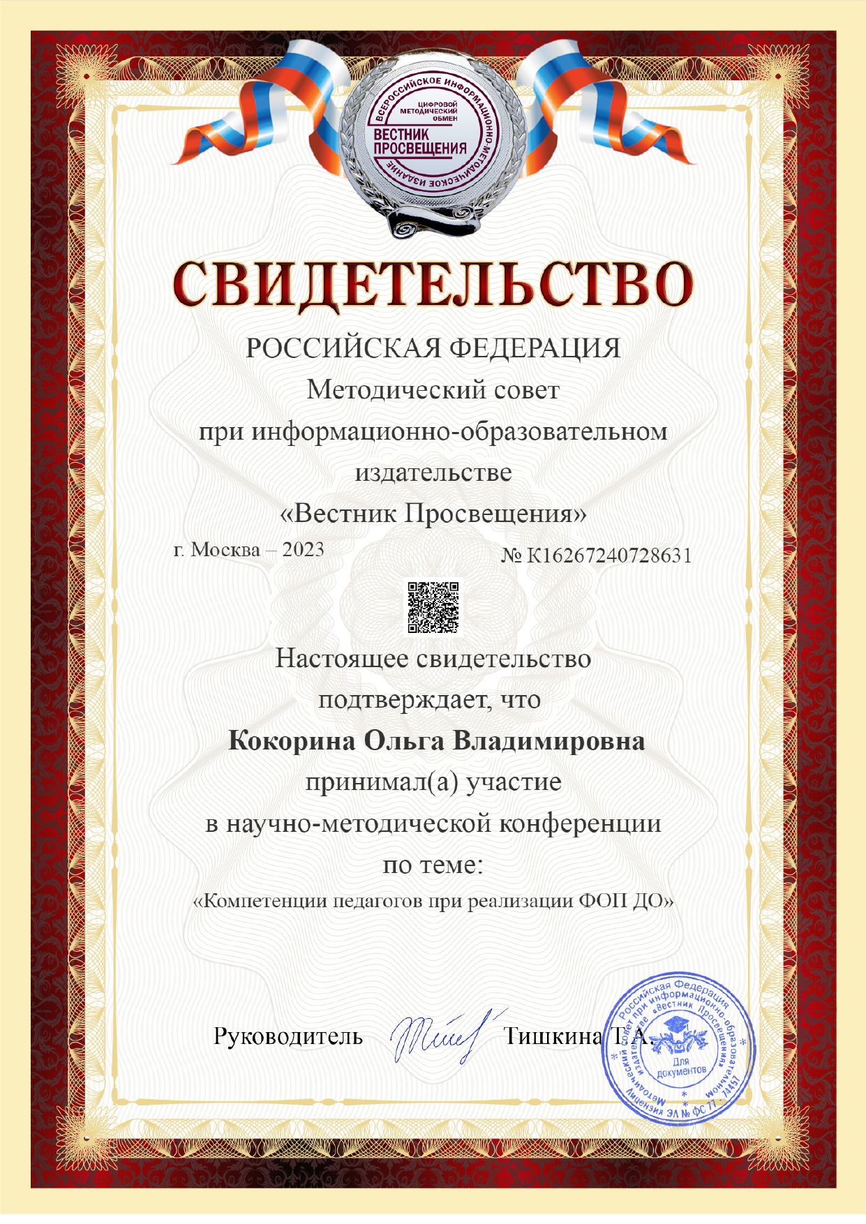 Свидетельство по теме "Дошкольное образование во в взаимосвязи с обновленными ФГОС начального и общего образования"