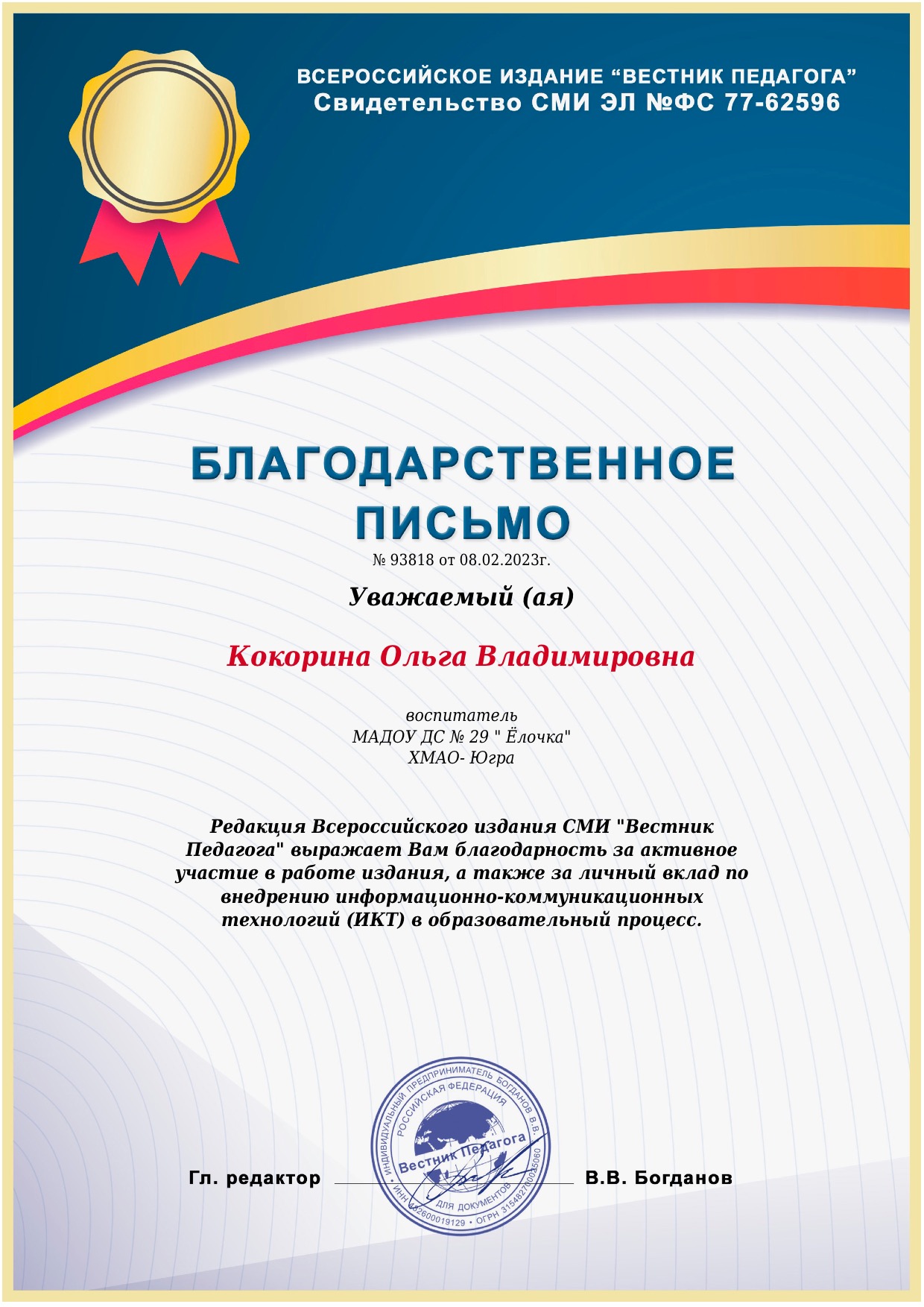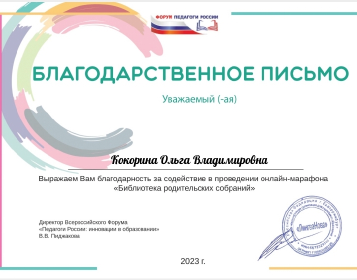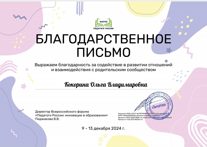 Благодарственное письмо за активное участие в конкурсах "Вестник педагога"