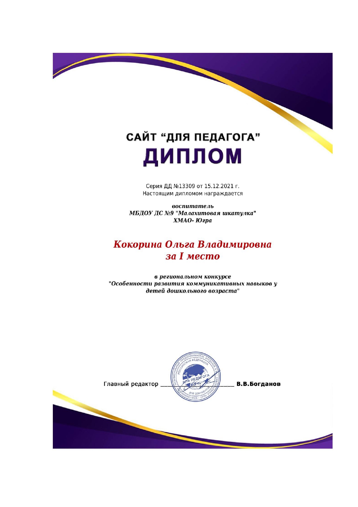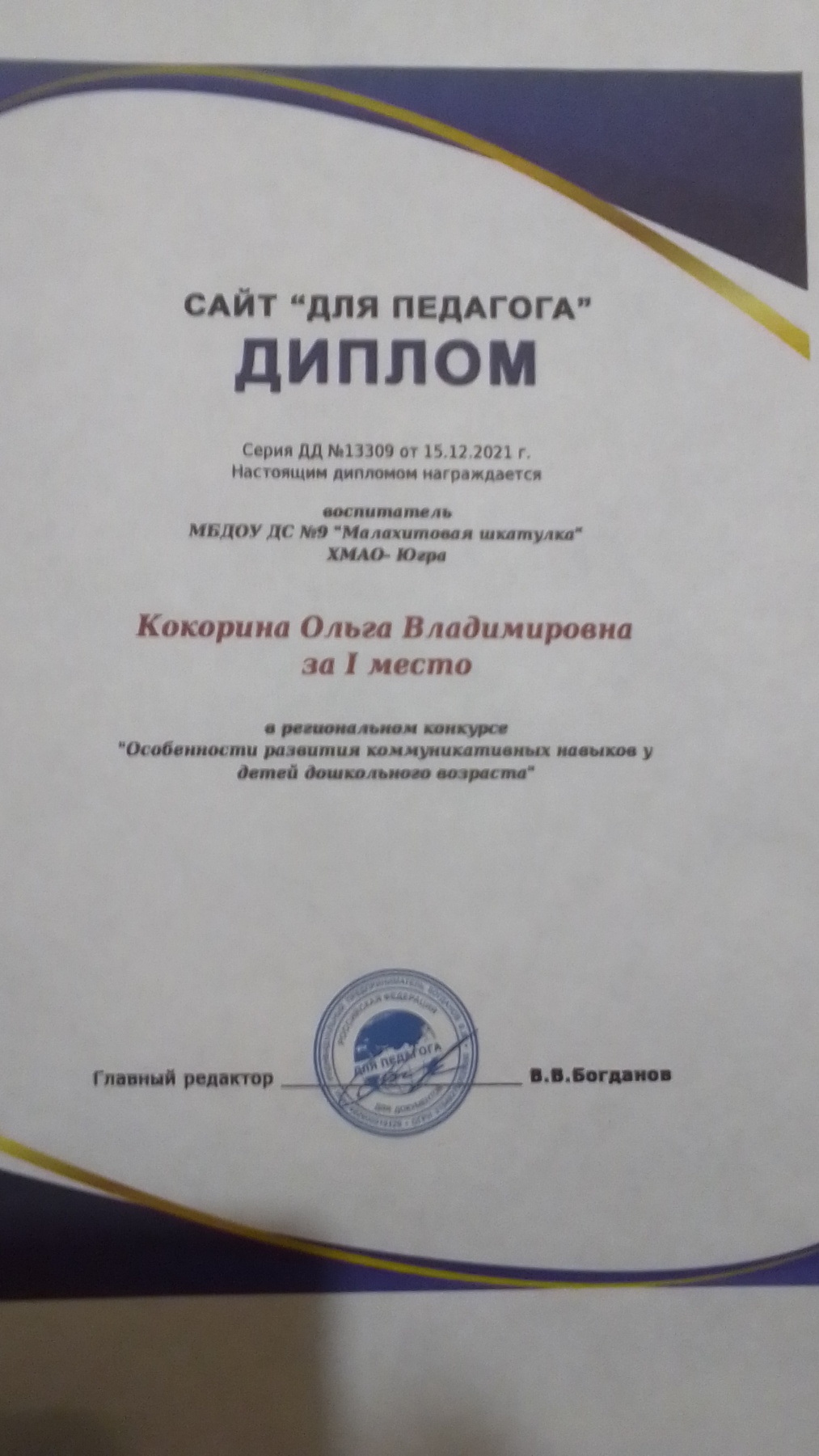 Диплом за I место в региональном конкурсе "Особенности развития коммуникативных навыков у детей дошкольного возраста"