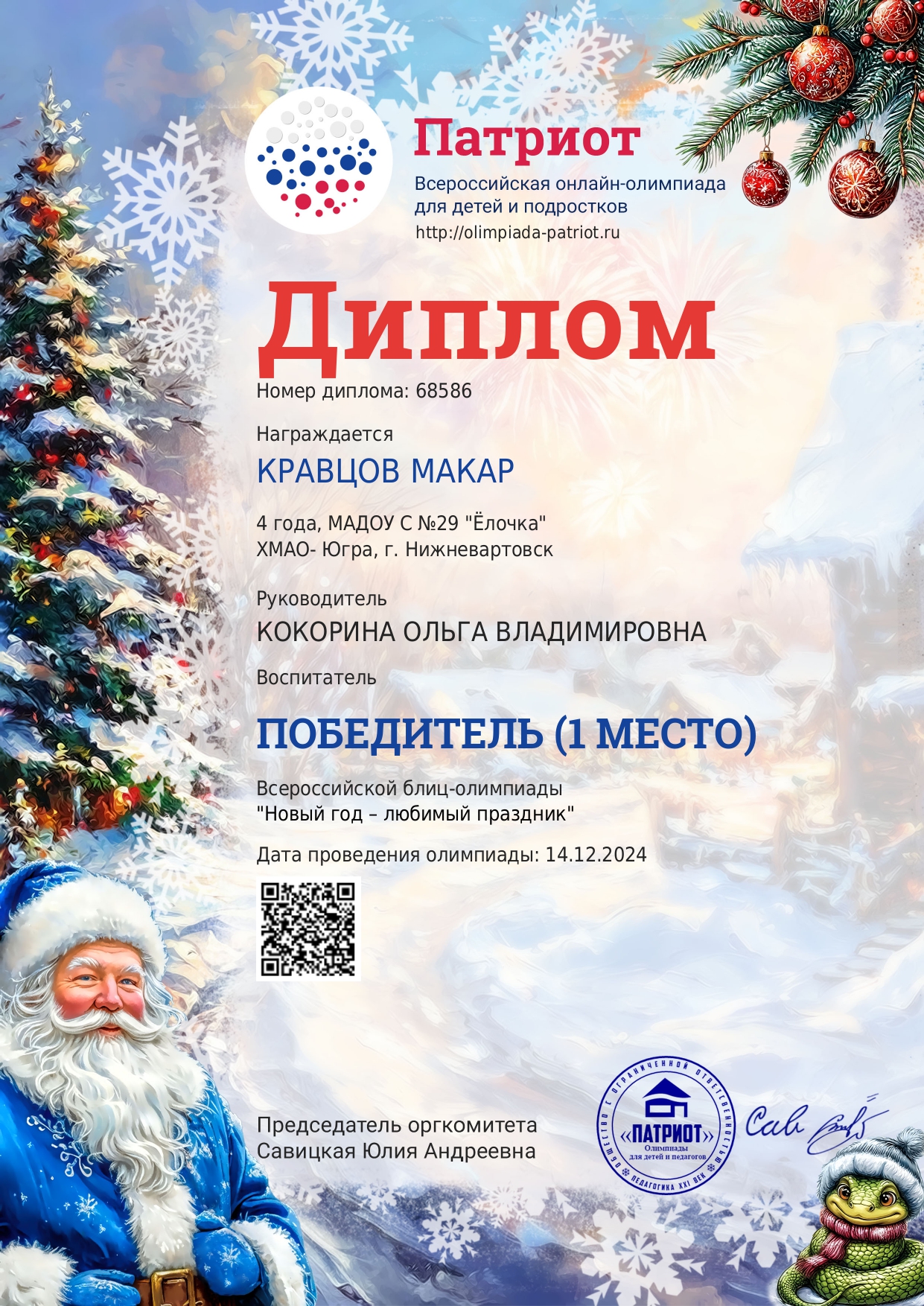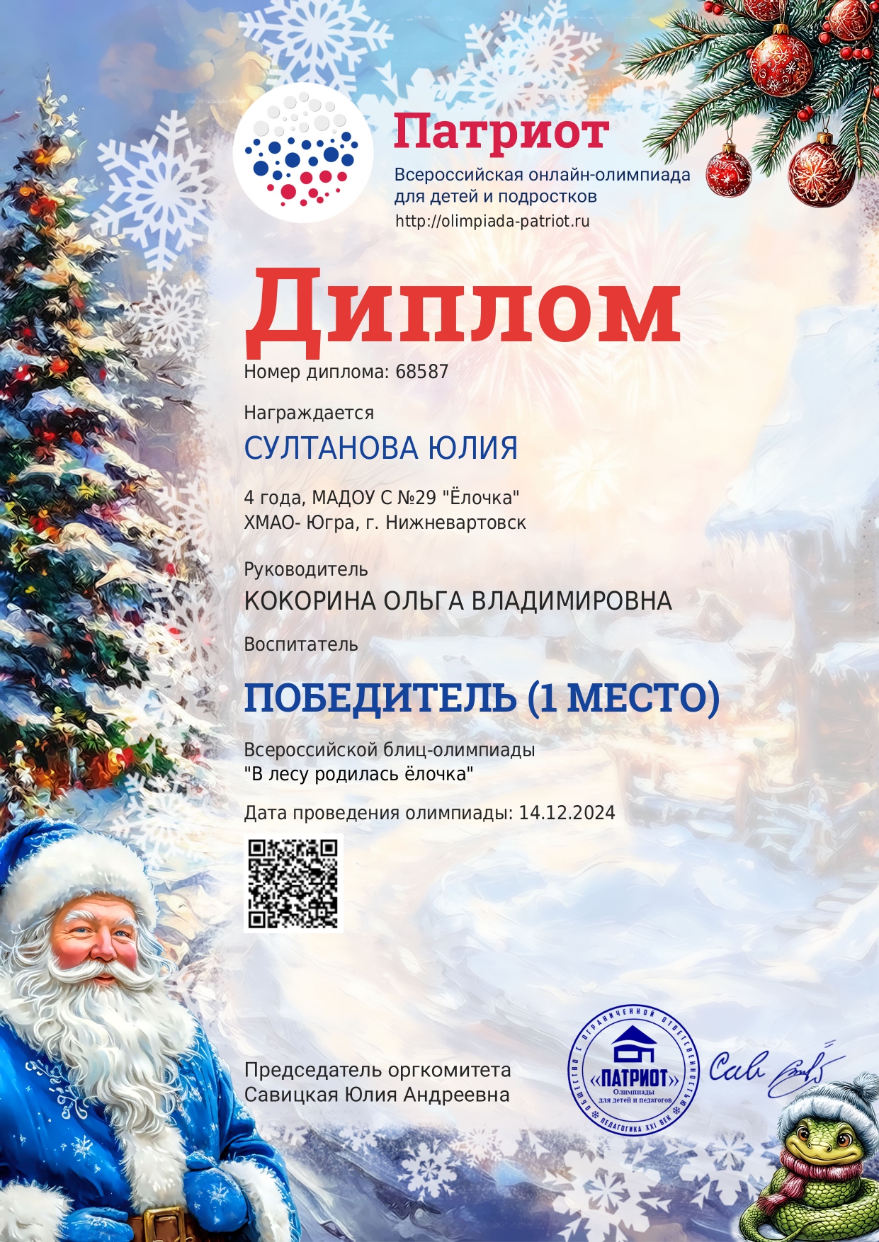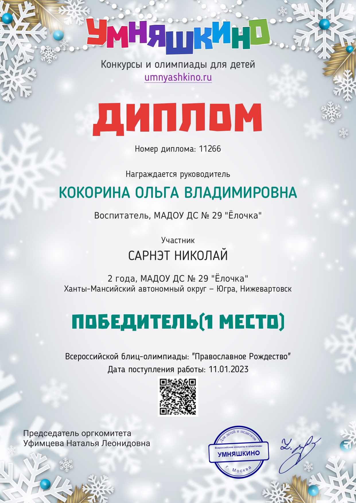 Диплом 1 место в всероссийской блиц - олимпиады " Православное Рождество"
