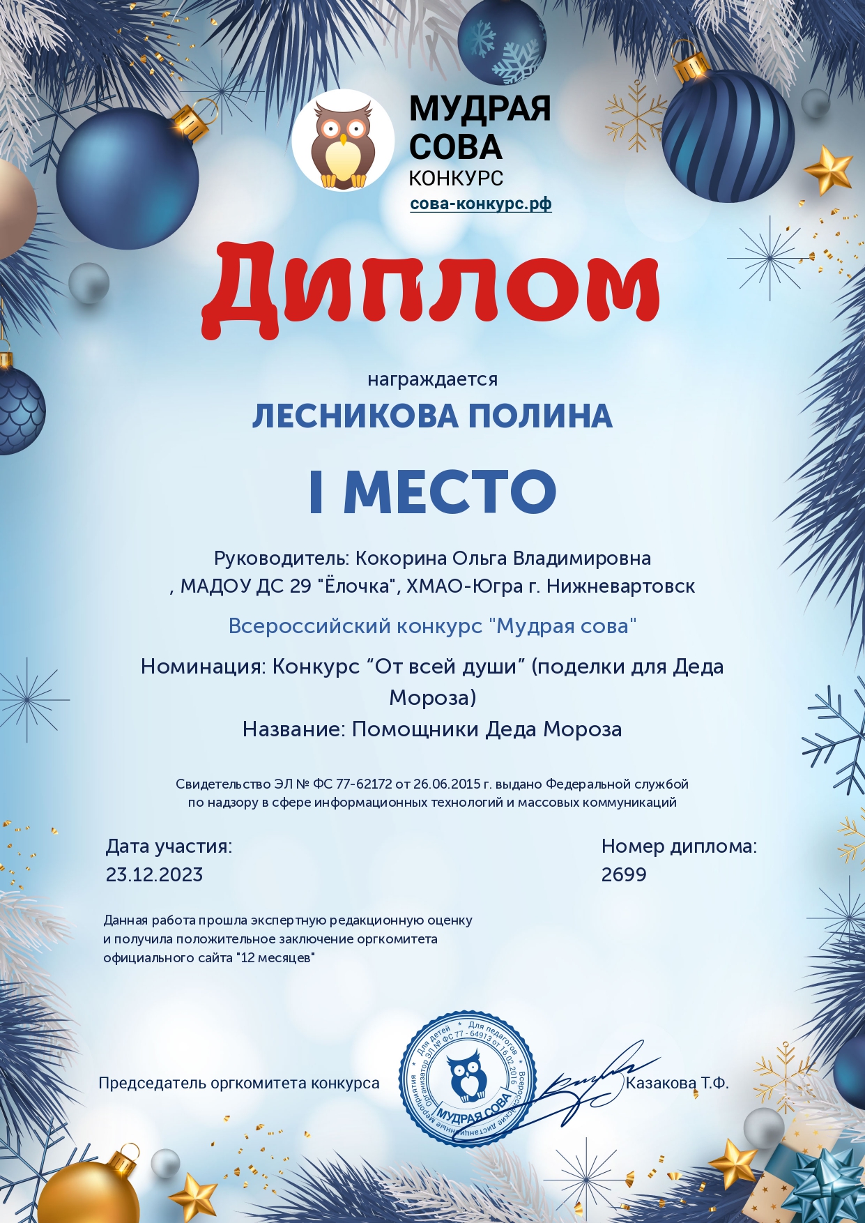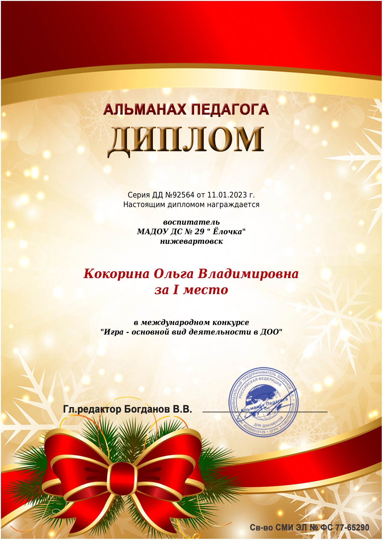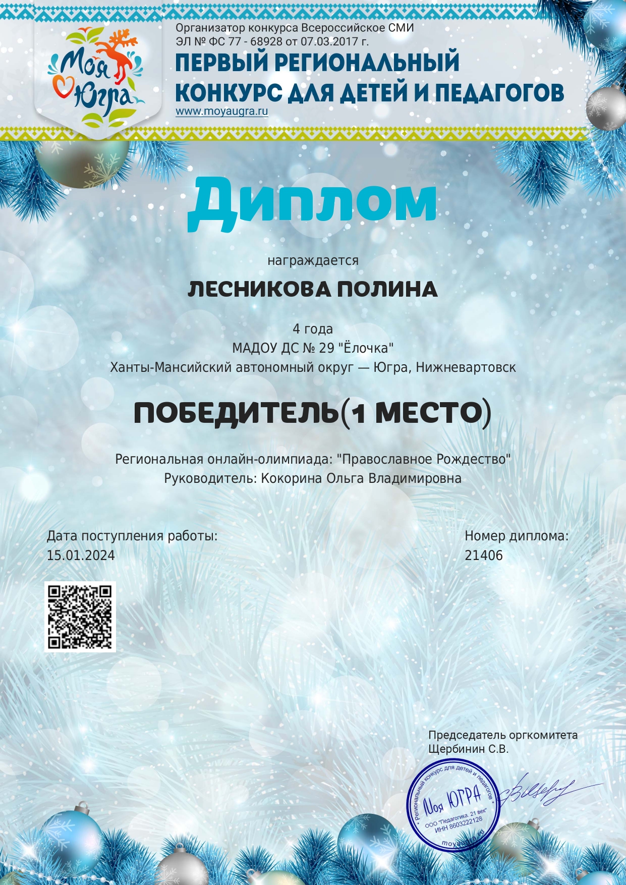 Диплом 1 место в всероссийской блиц - олимпиады " Православное Рождество"