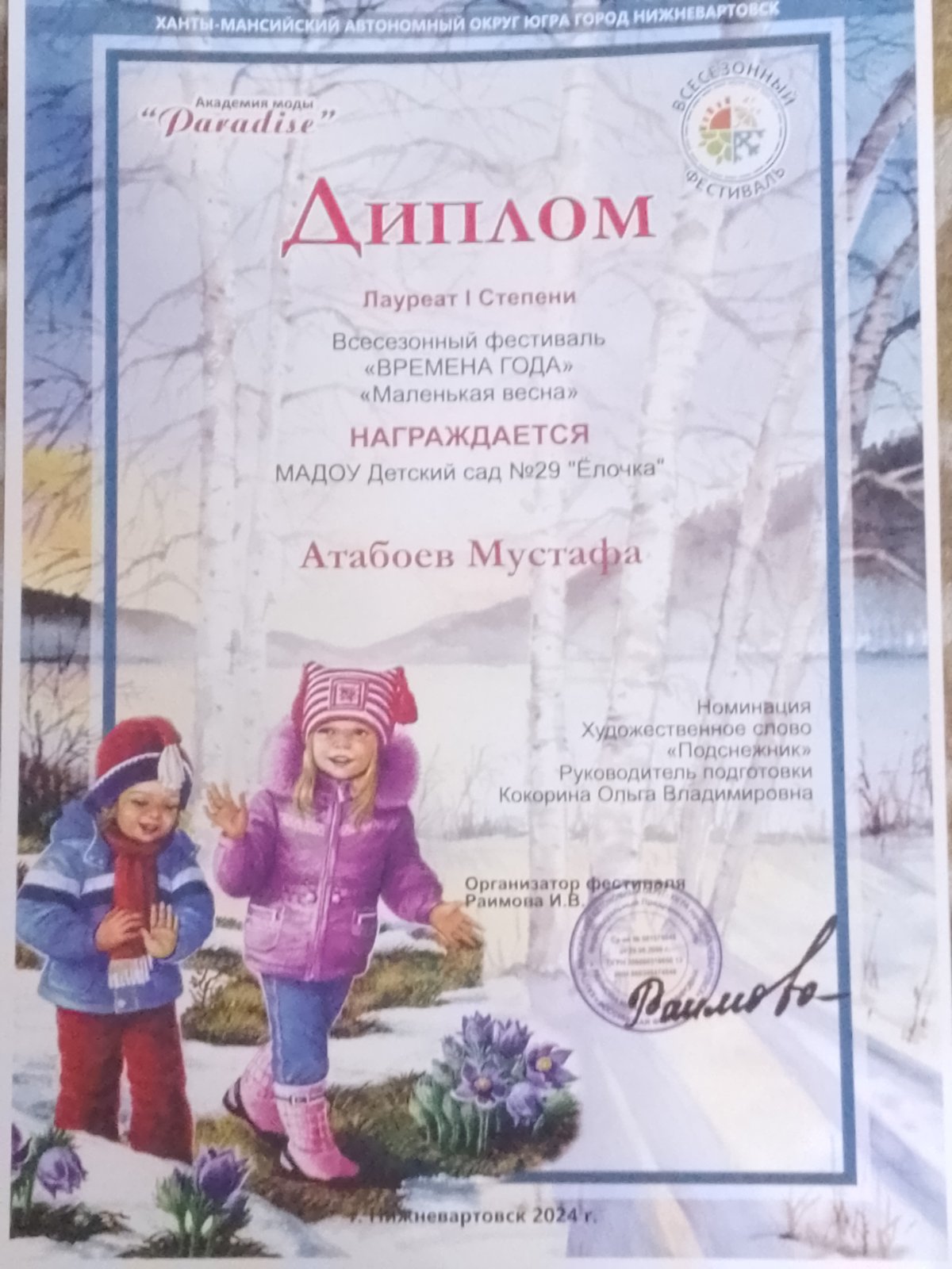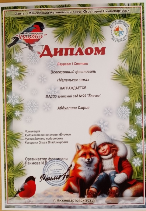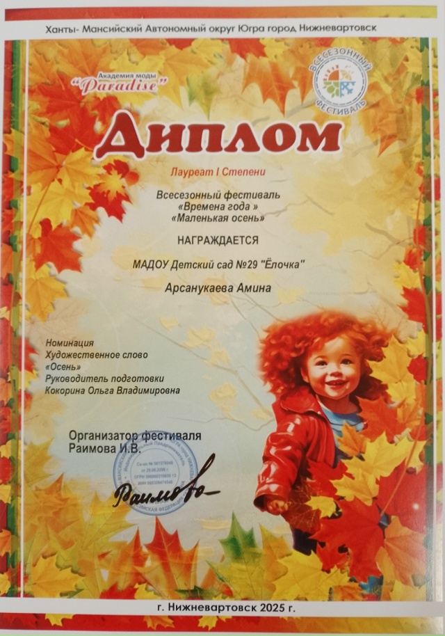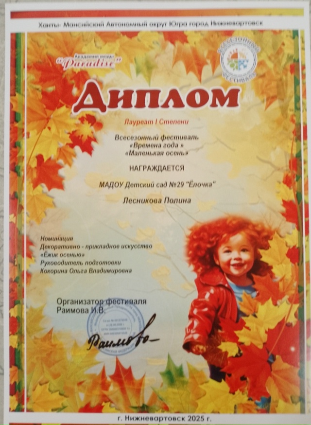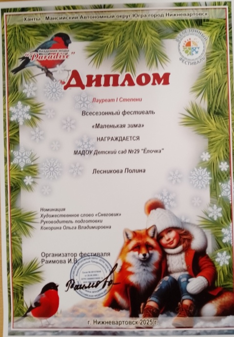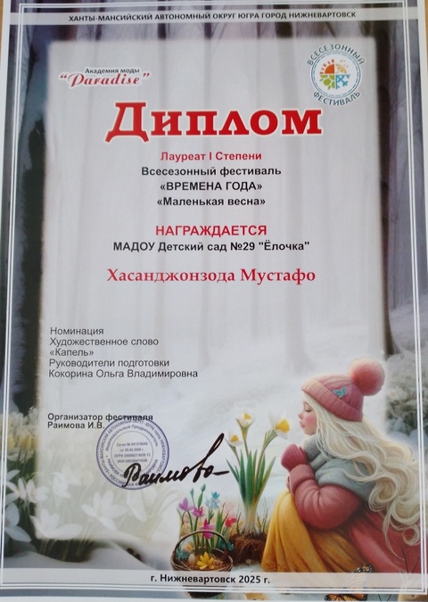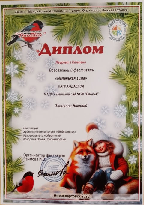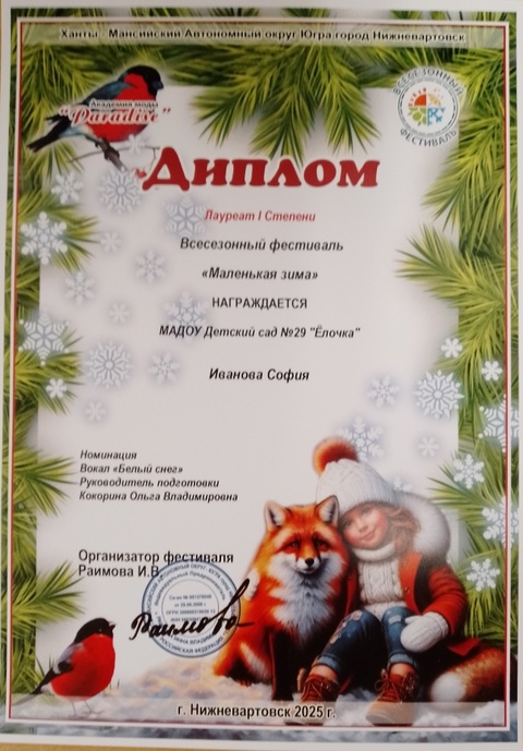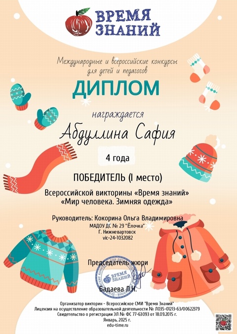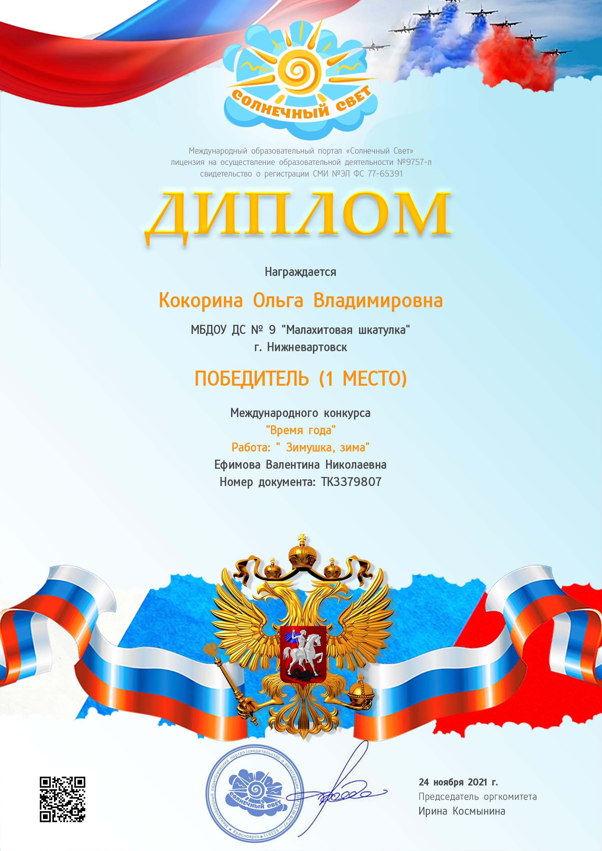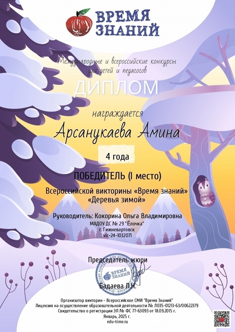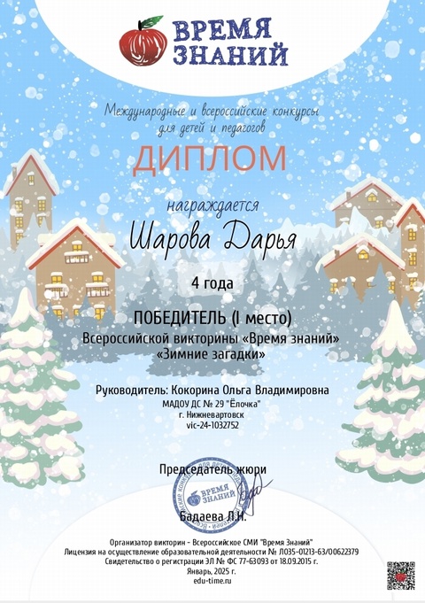 Диплом победителя в международном конкурсе "Время года"
