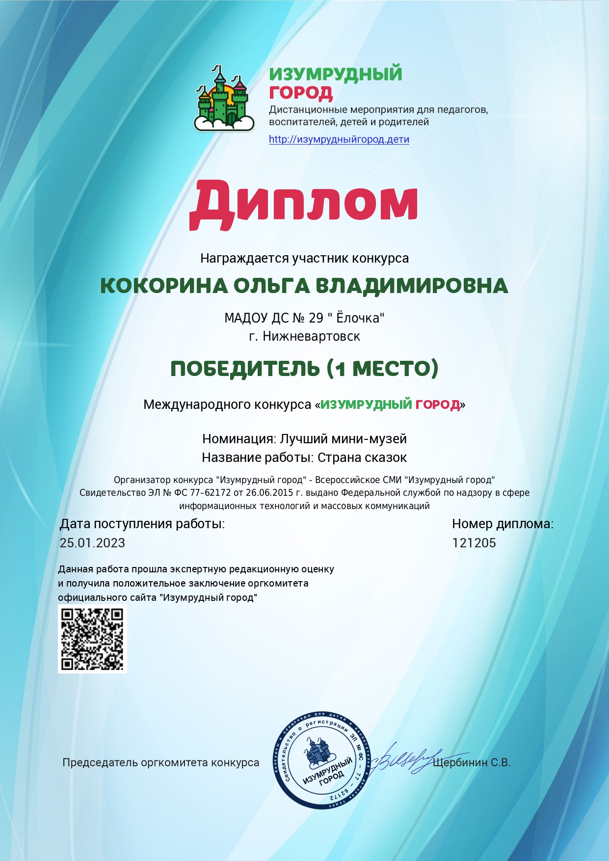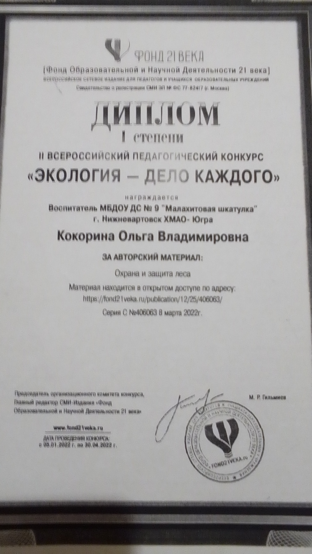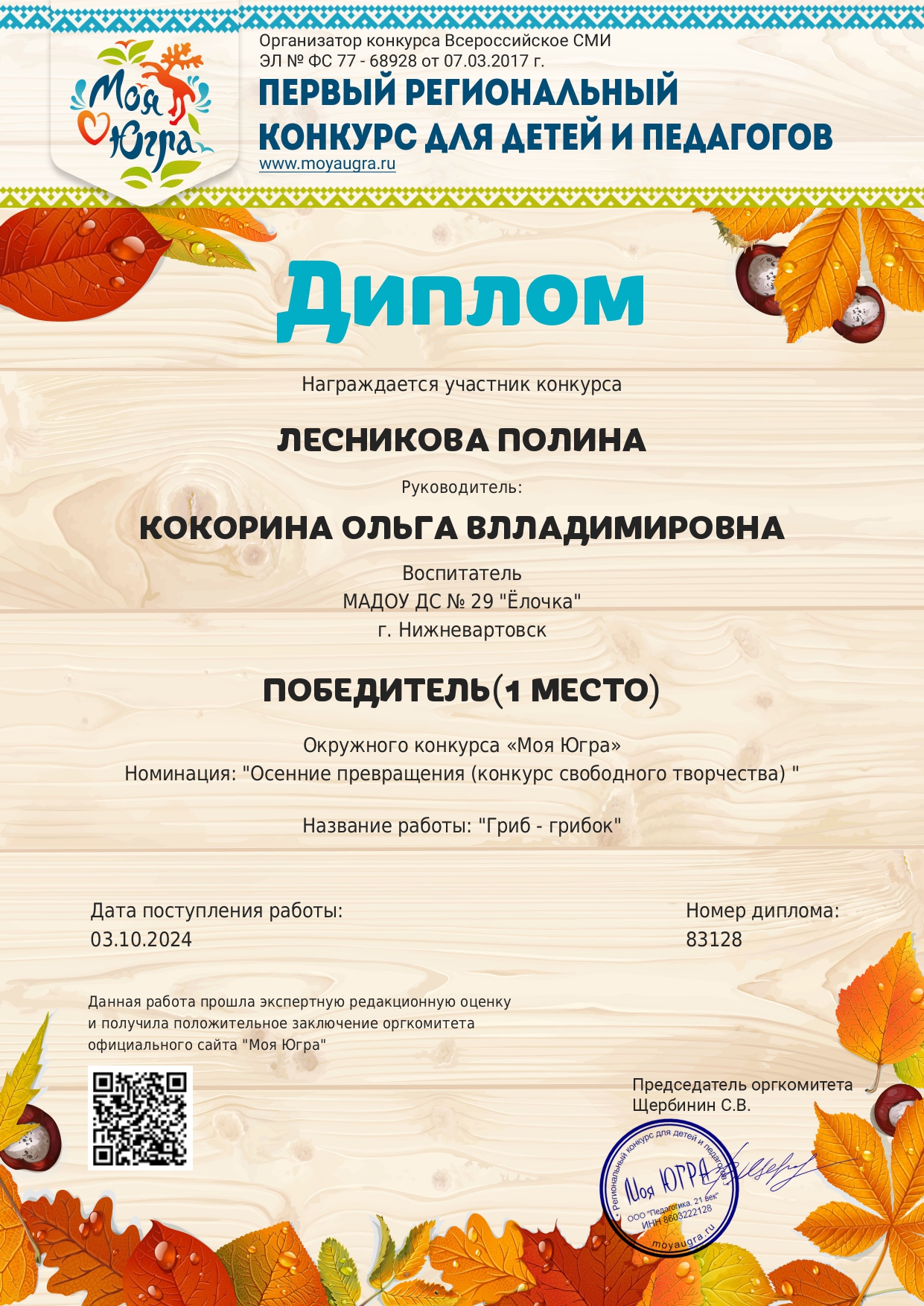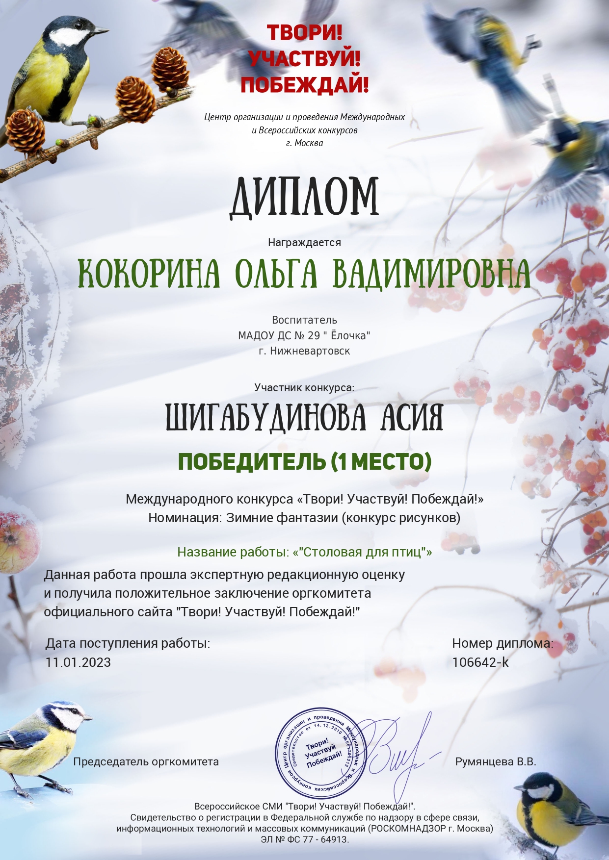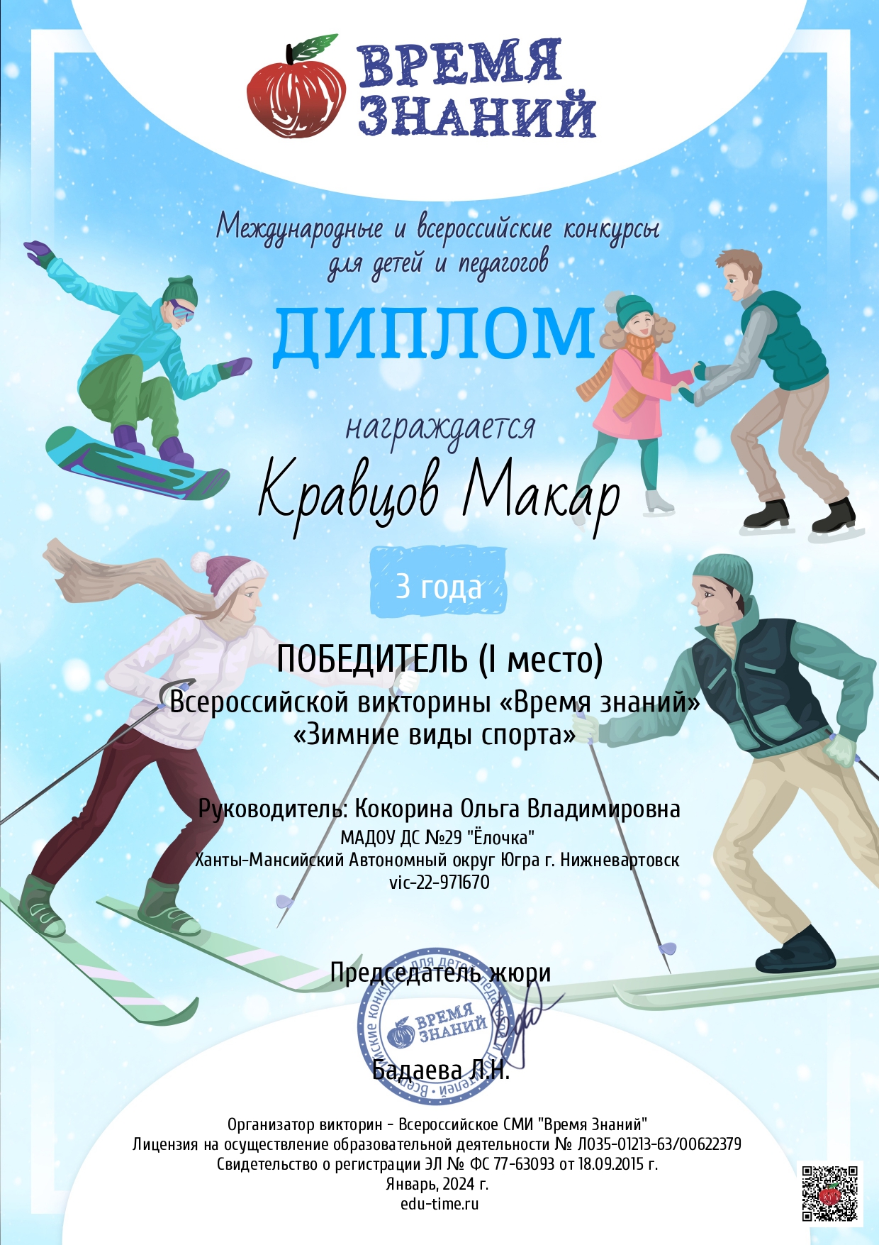 Диплом победителя в международном конкурсе "Время года"