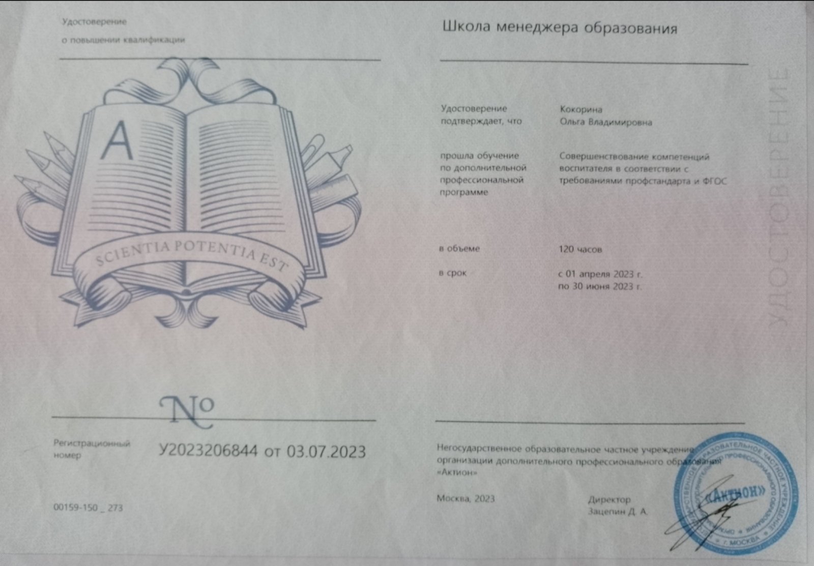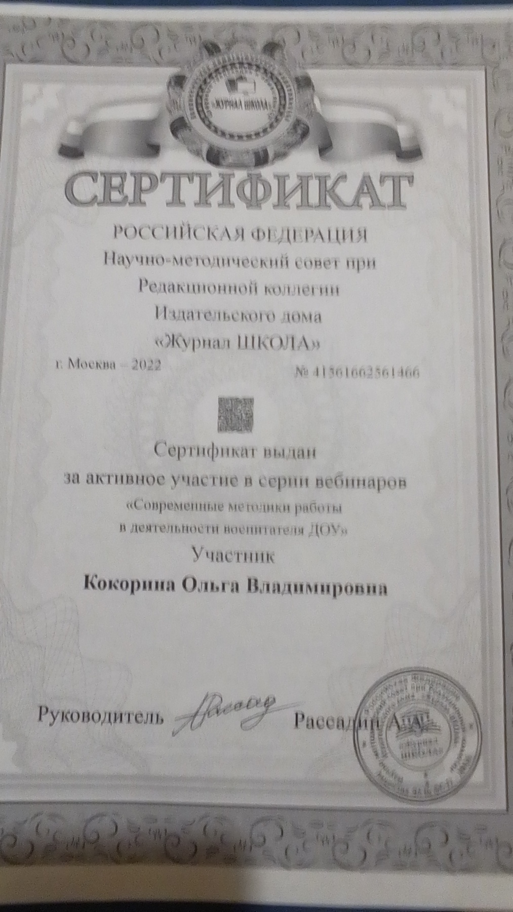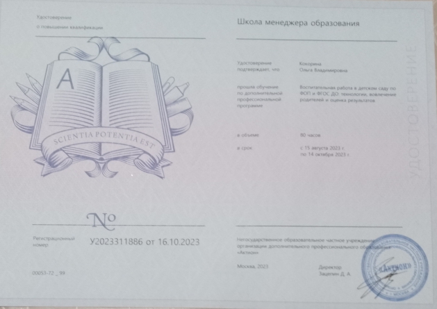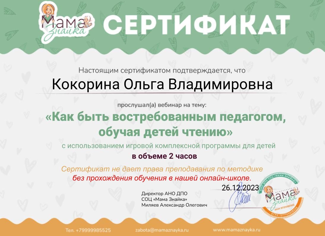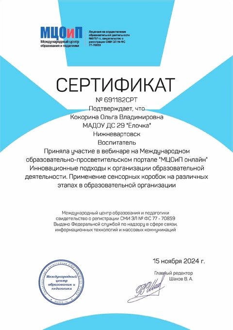 Сертификат "Современные методики работы в деятельности воспитателя ДОУ"