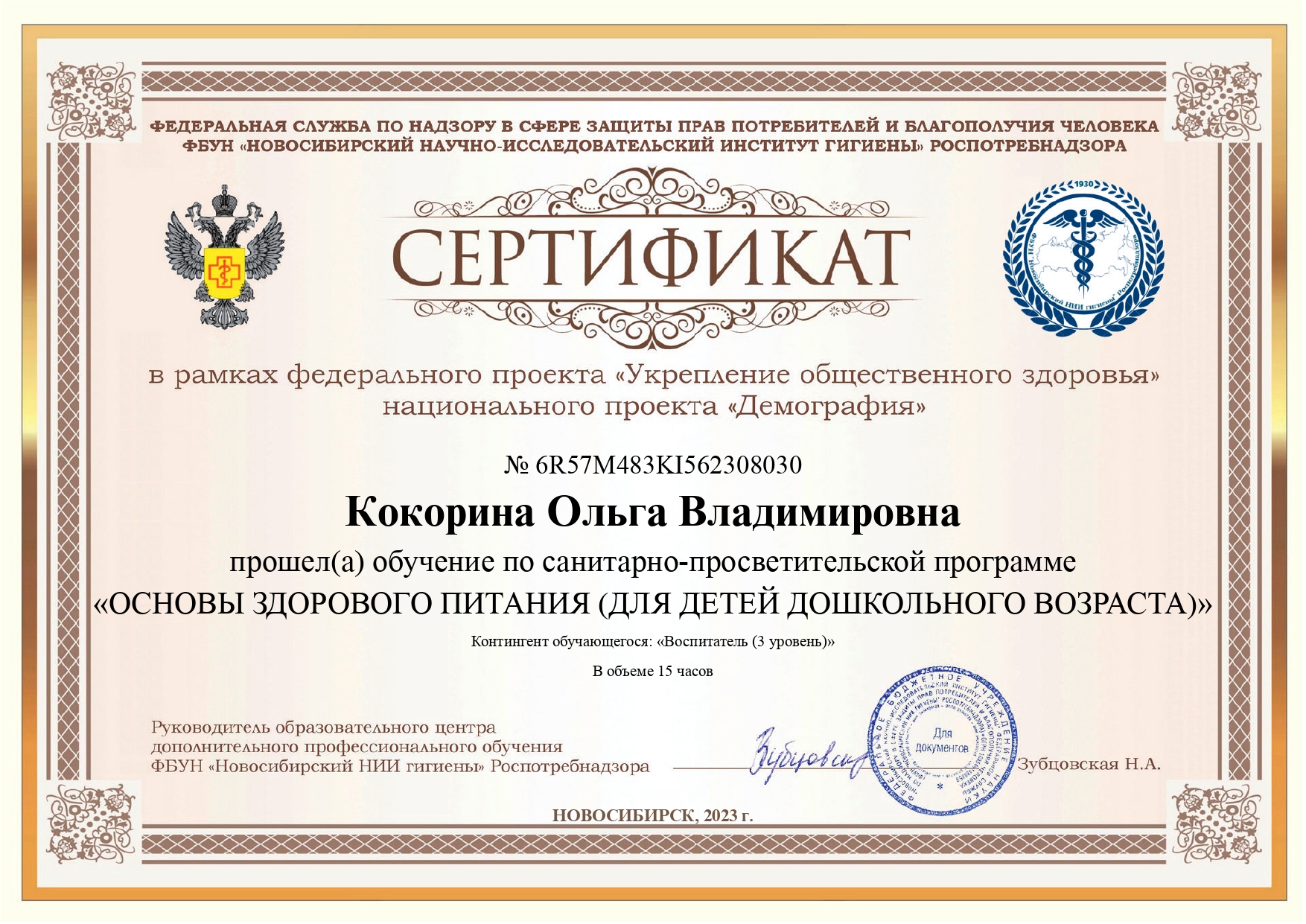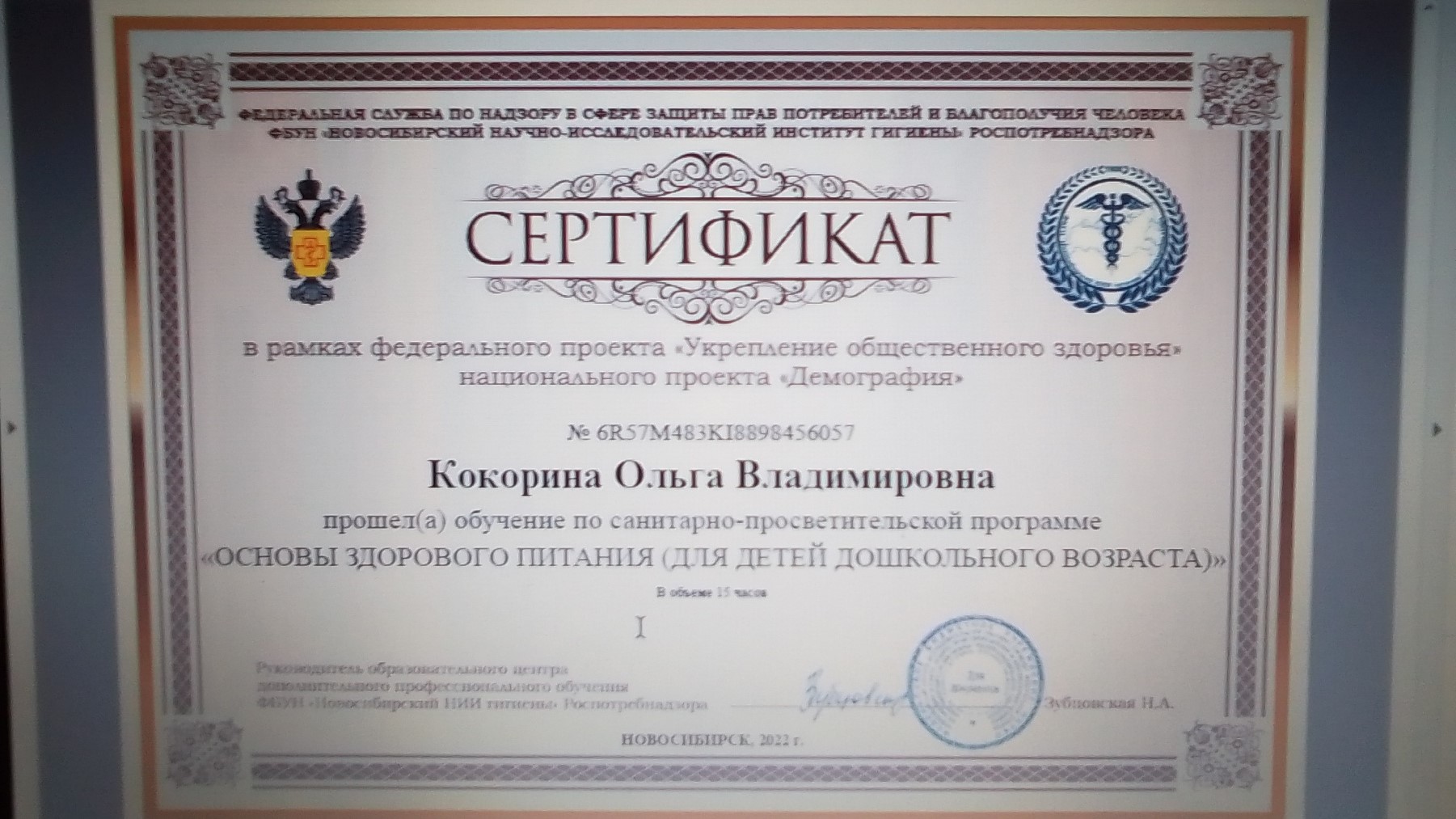 Сертификат по санитарно-просветительной программе "Основы здорового питания для детей дошкольного возраста"