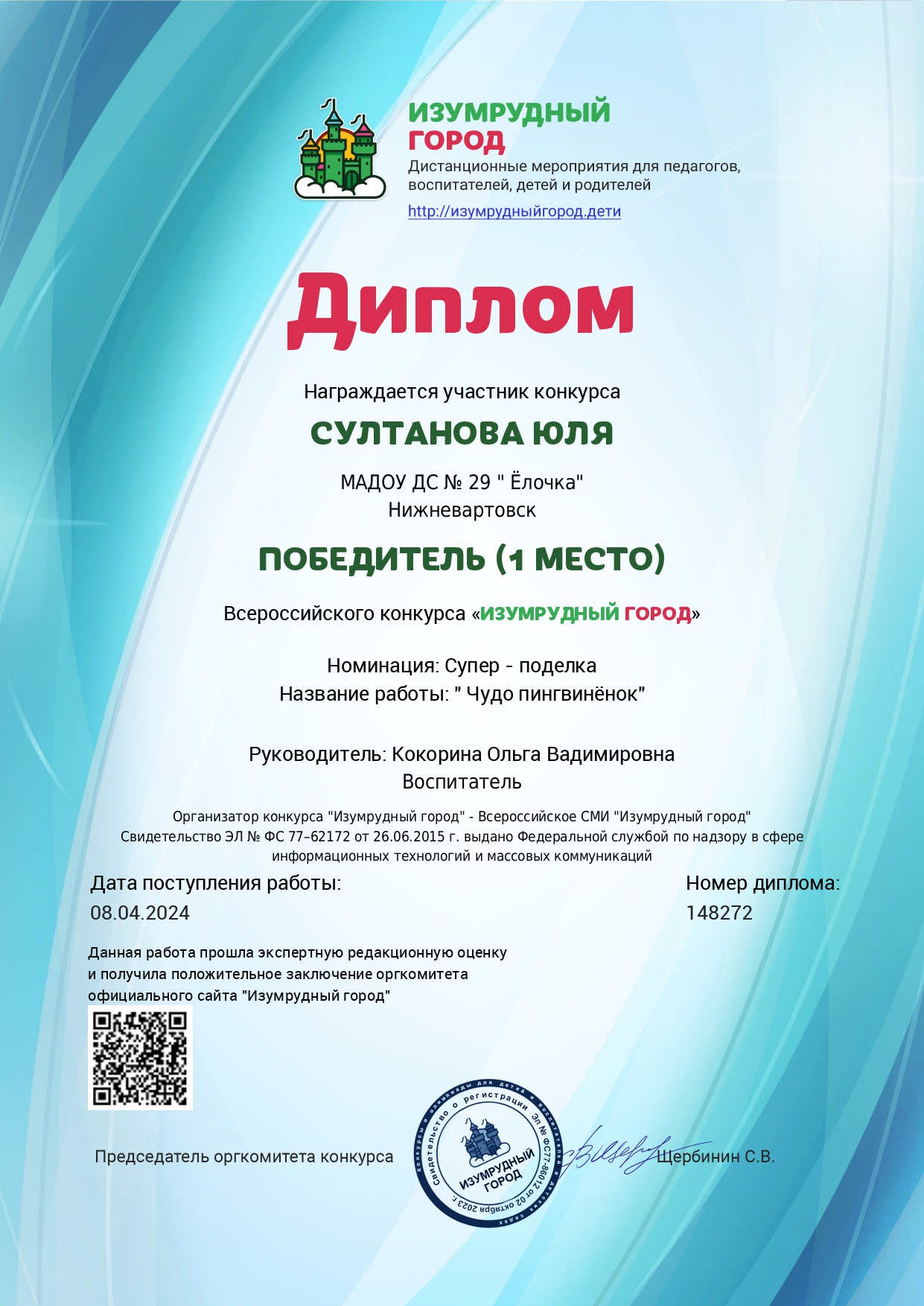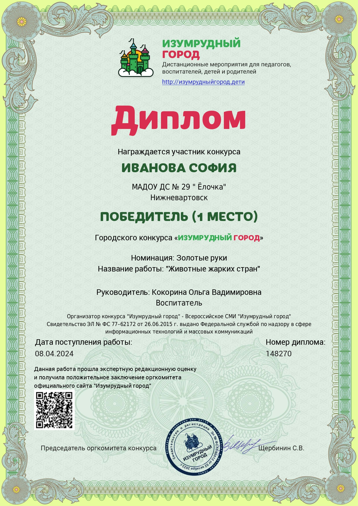 Диплом победителя в номинации "Декоративно-прикладное и изобразительное творчество"