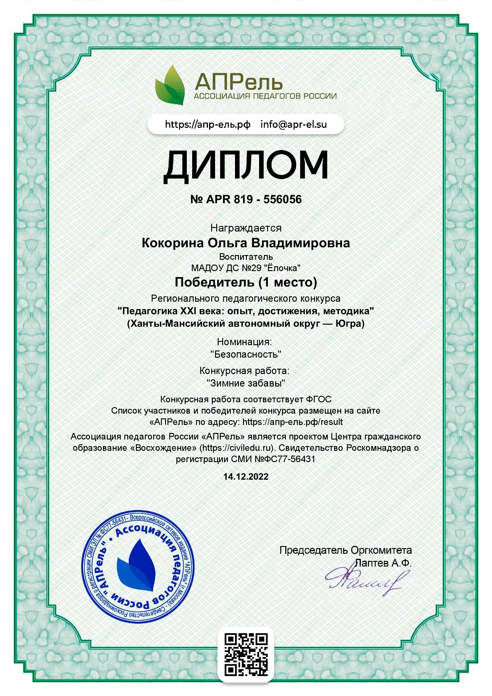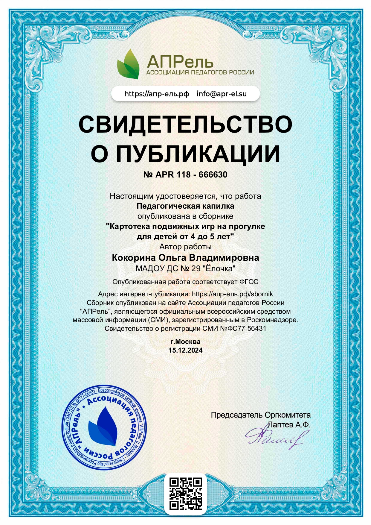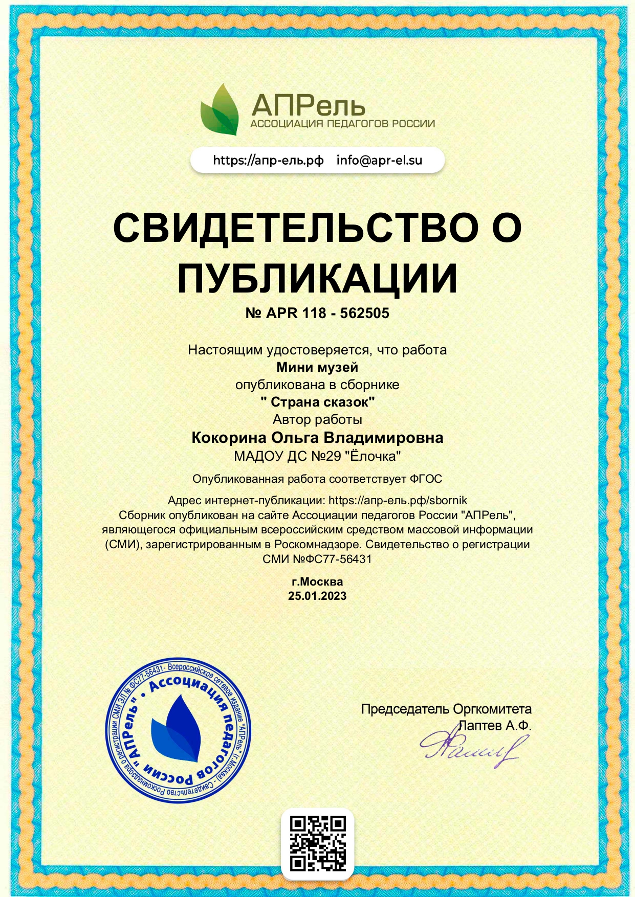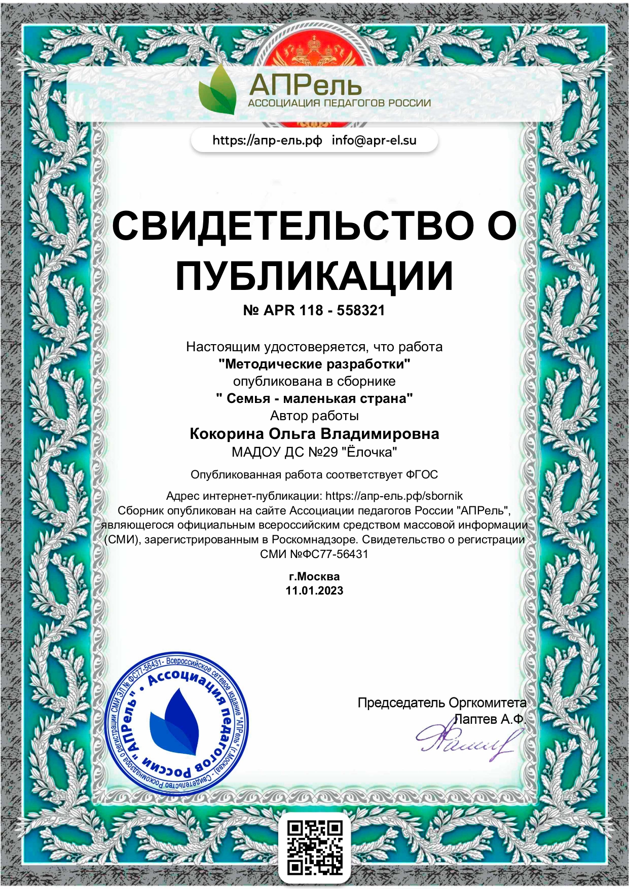 Свидетельство о публикации "АПРель ассоциация педагогов России"