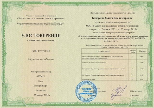 "Организации педагогического процесса по обучению игре в шашки и шахматам детей дошкольного возраста в рамках реализации ФГОС ДО и ФОП ДО" 72 часа